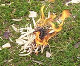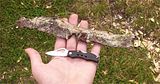 The problem then becomes how to keep the fire going. Shavings burn very rapidly and the knife is simply too small and too thin (0.077" thick) to break apart woods quickly. It can be used to carve wedges and take apart woods that way and in the long run that is pretty much the only option. However in the short term it works well on thick pitch filled barks :