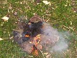 This can then pry off the thick barks very aggressively and the point sharpened as necessary as it blunts through contact with the wood. With thick barks a fire can be kept going while thicker branches and such are gathered. The smoke will also keep insects away and provide some light and heat. This bark was really wet as it had been raining a lot lately. When it is dry it doesn't last very long so large pieces only last minutes. The fire was mainly sustained buy the several pieces which had thick sections of pitch.