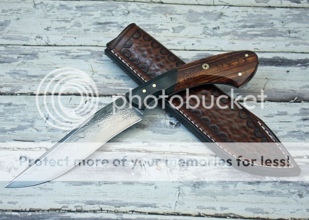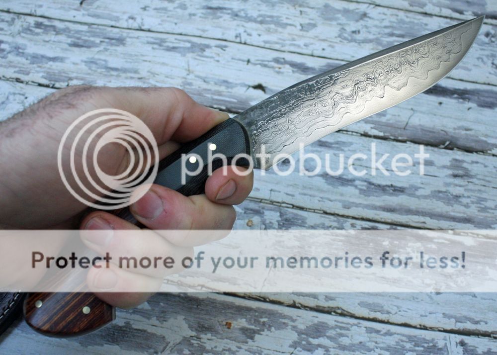 The handle is black canvas micarta with some really nicely figured cocobolo. It is faceted and polished to a nice luster. It fits the hand well and is held in place with pins and G-flex epoxy.