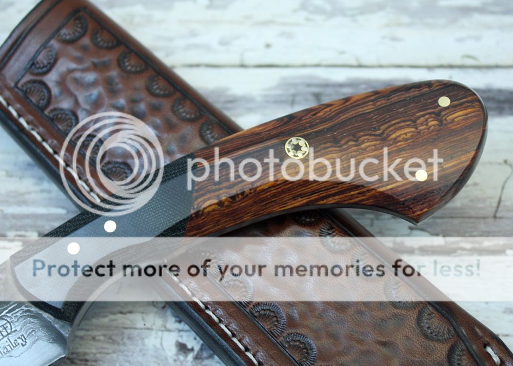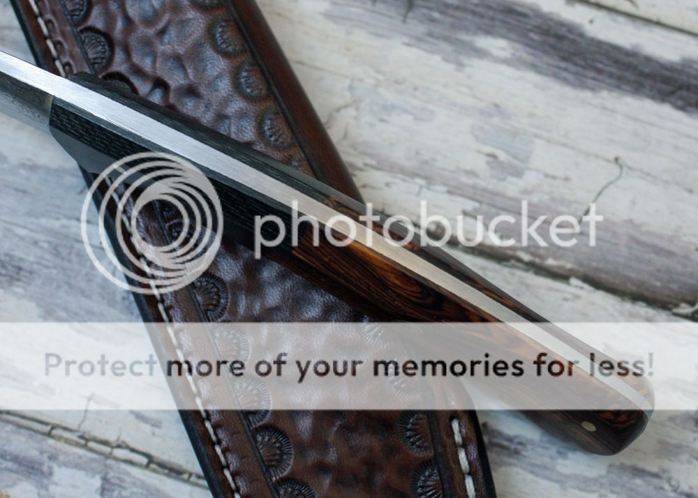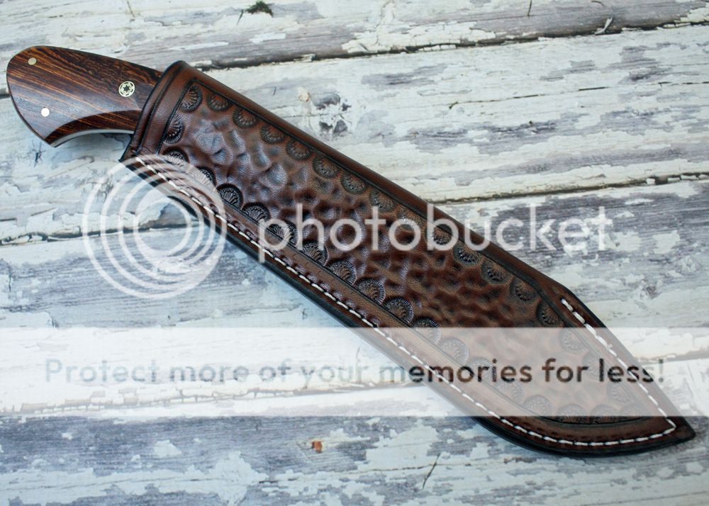 The sheath is 7-8oz hand tooled leather from Wickett and Craig. It holds the knife securely and allows for an easy draw.