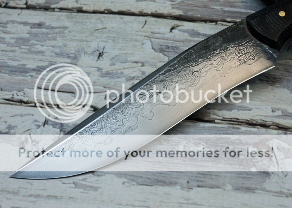 So, I took some cable damascus I had made, and made a san mai billet with 1095 as the core. I forged it out and made it into this recurve. It was hand sanded to 1000 grit and etched to show the details of the cable.