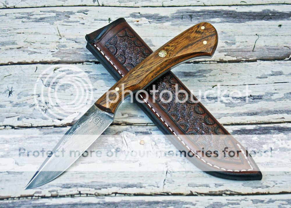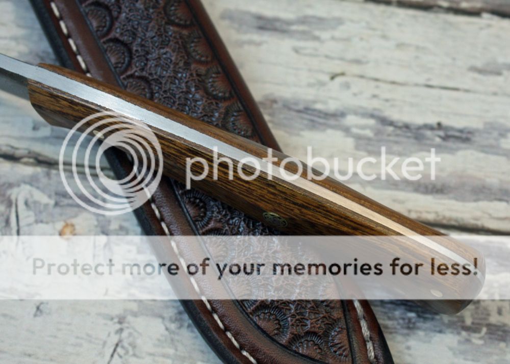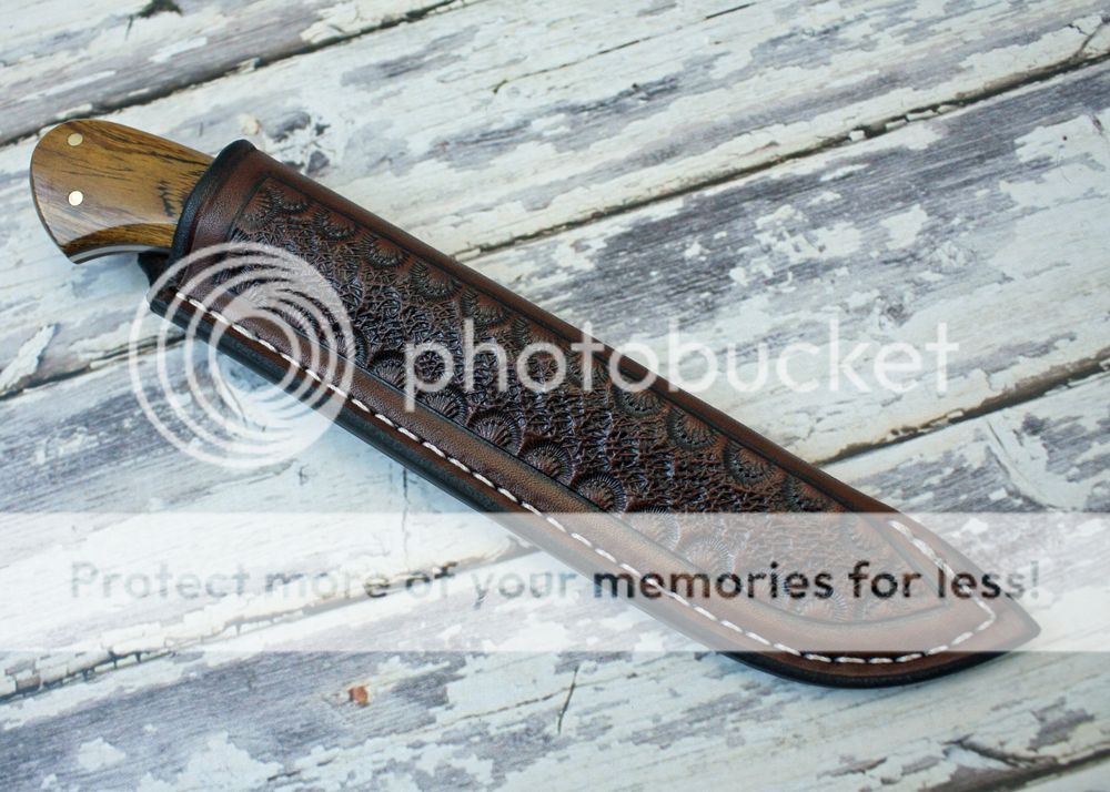The sheath is hand tooled leather from Wickett and Craig. The knife fits well and draws easily.