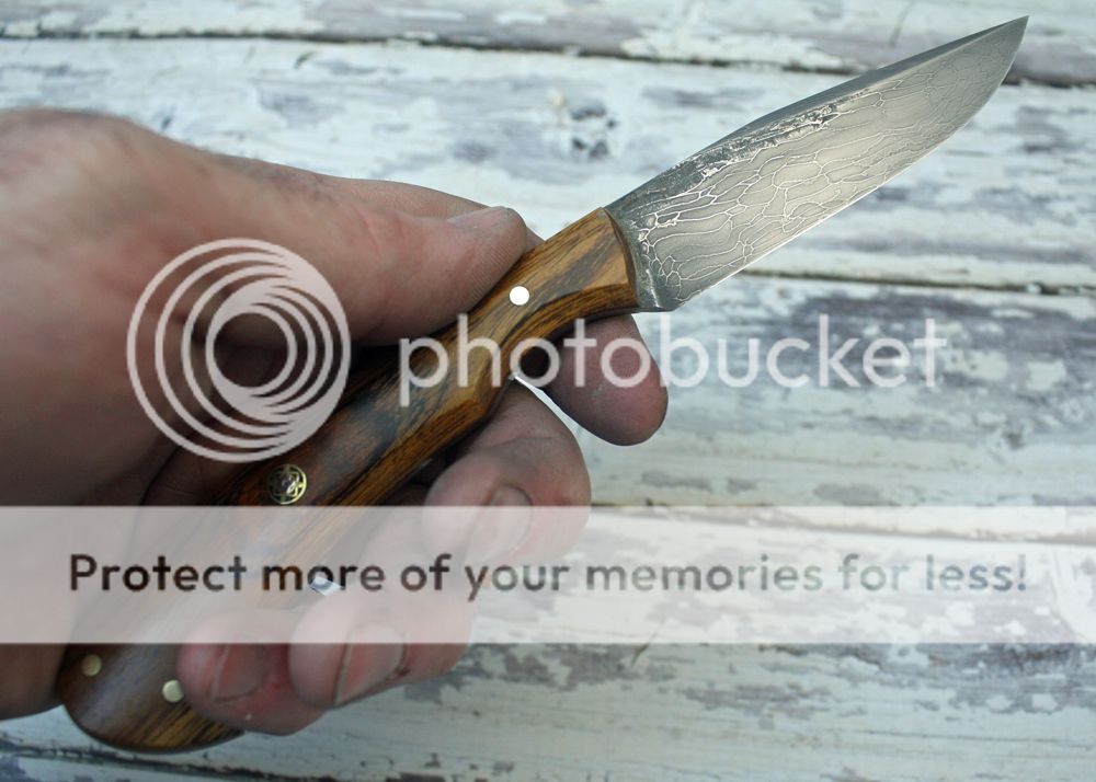 The handle is desert ironwood. It is sculpted, faceted and polished and fits the hand well. It is held in place with pins and G-flex epoxy.