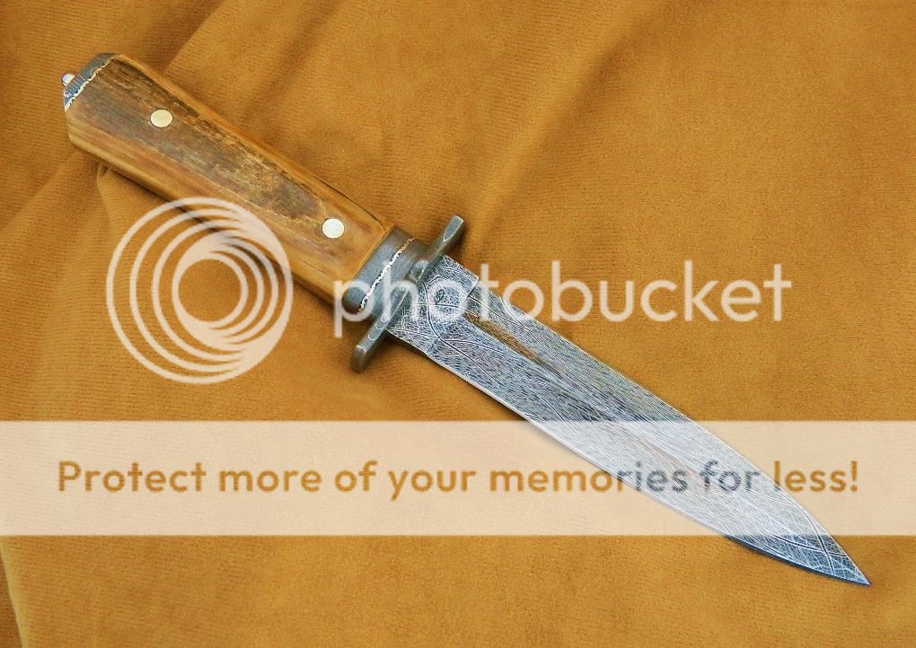 This one has 6" blade made from Bob Eggerland damascus, with Chad Nichols damascus guard and pommel, brad Vice damascus spacers, S/S pins and file worked spacers. Price is $800, Will except PayPal will and will pay USPS shipment inside US.