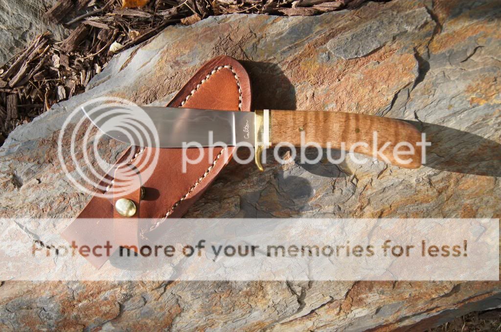 I have an unused and never carried hunter in tiger maple with handmade sheath from Joe Calton. Specifics are below: