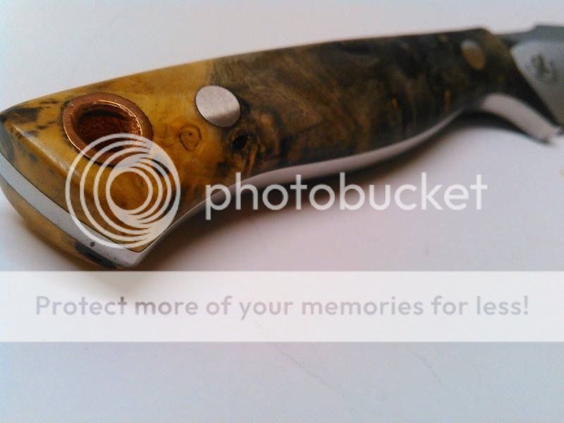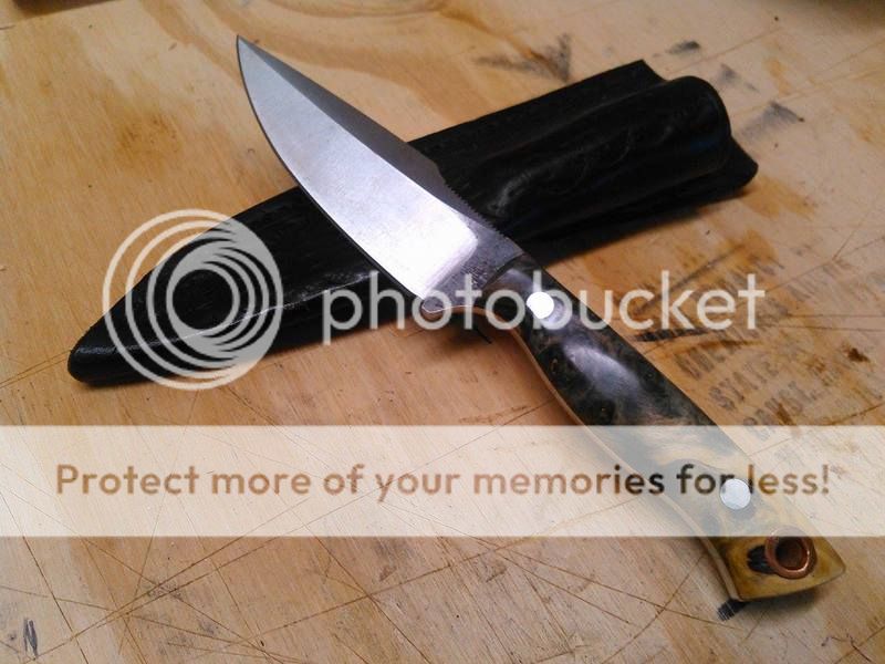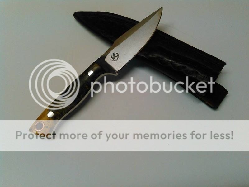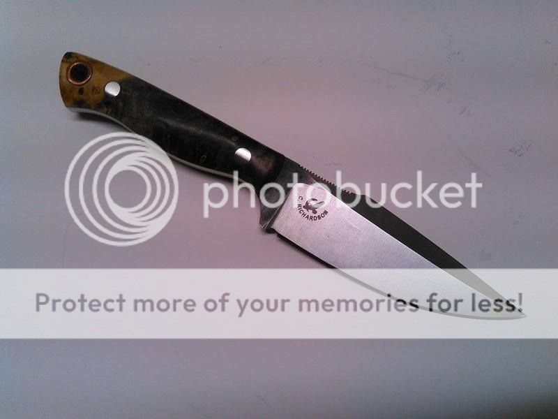 Calvin Richardson custom. 8" overall, 4" blade, 1/4" thick. Full flat grind. Cmp 3v steel. Stabilized burl handles, 1/4" stainless pins, brass lanyard tube. Leather sheath included. $250