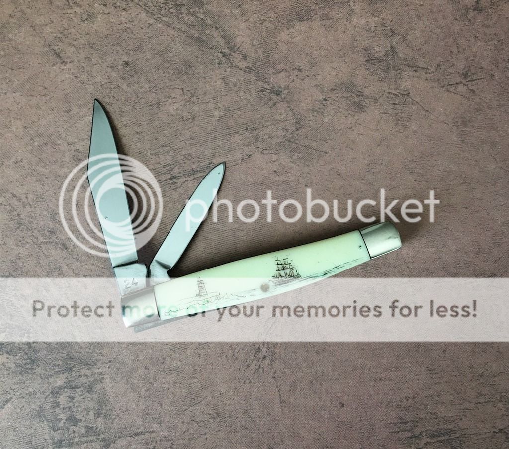 I'm guessing that Camillus didn't actually do the scrimshaw etching, as the 1984 catalog notes that these simulated ivory scales are "suitable for stamping". So perhaps a gift shop owner had a vendor stamp the sailing motif on the handles for him? An oddity is that the scrimshaw is on the pile side, not the mark side. Is this an obvious "Oops!" or does commercial scrimshaw sometimes appear on the back handle? (I will say that because of the small size of the knife, the sailing ship and lighthouse look much better in person than they do in the enlarged picture in this post.)