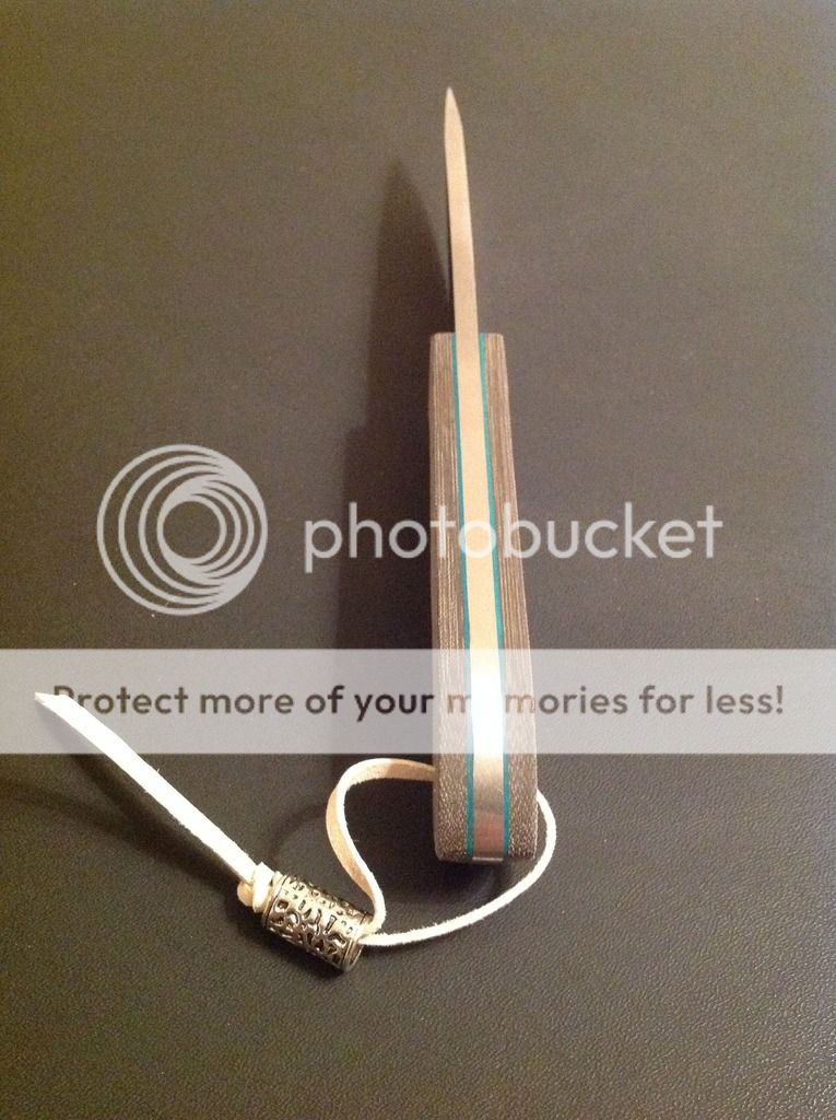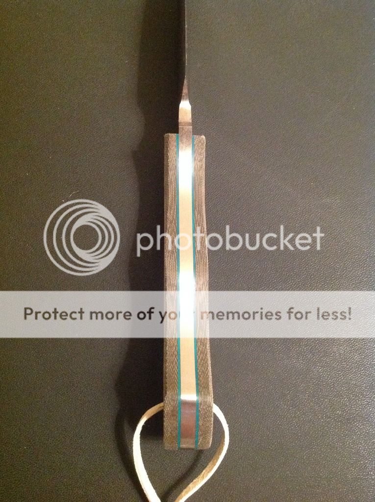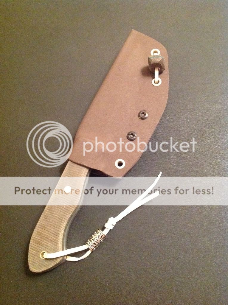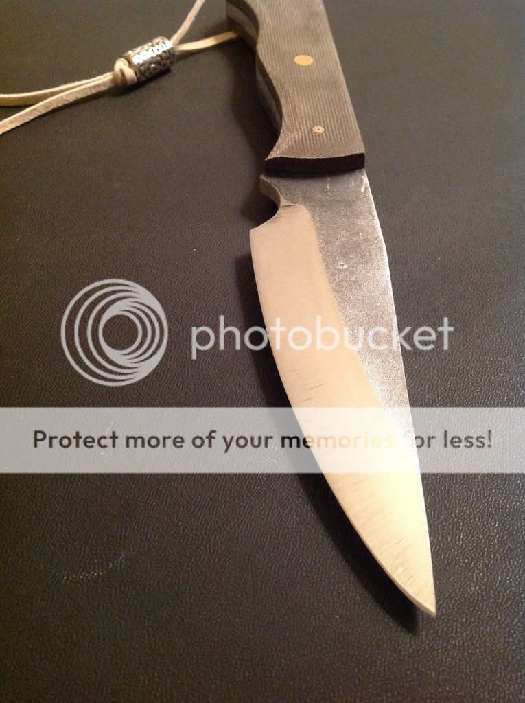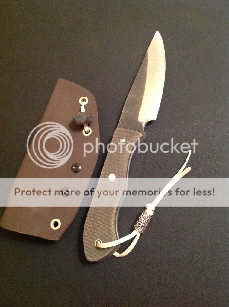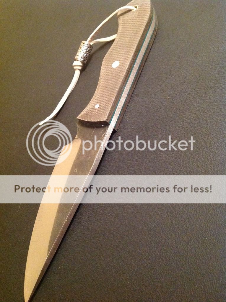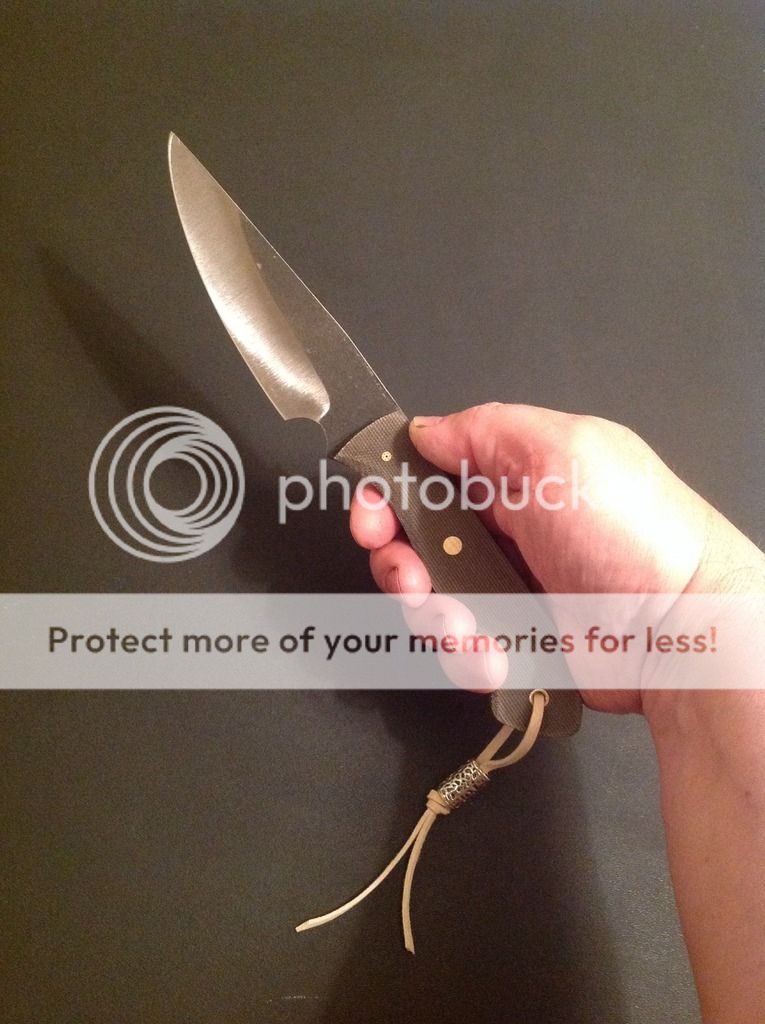 Hi all, this is my latest offering. It is a camp knife ready for some hard use! It is made from .23 inch 440C stainless steel with a flat grind and razor sharp micro-bevel. The knife is 9 3/4 inches overall length, with a 4 1/2 inch cutting edge. The handles are green linen micarta with green vulcanized paper liners, really a beautiful combination for an outdoor knife. The scales are epoxied on and have a small decorative pin, one 1/4 inch brass pin and a brass-lined lanyard tube. The knife comes with the kydex sheath and Tek-lok and lanyard and matching bead as shown. Asking $175. Paypal and money orders accepted. Free shipping in US, charge for international. Thanks for looking, I hope you like it!