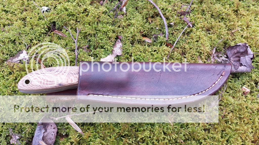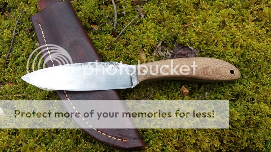 Here is a Canadian Belt Knife forged from 3/16" W2. Blade is 4 1/4" with forging left on the flats and jimping on the spine. It is polished to 1500 grit and etched to show the hamon. The handle is 4 1/8" with stabilized sycamore and brass hardware. Comes with leather sheath.