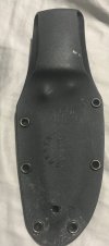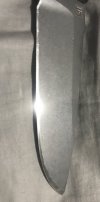 Field knife version 1 with pry bar. 3 v has been used and resharpened. I took this to 1600 grit on my wicked at 15 degrees. The tip got taken off, just the tip. See last photo; I didn’t reprofile the whole edge in response, just ground it out. theTerotuf handles over black liners. PRICE DROP $325