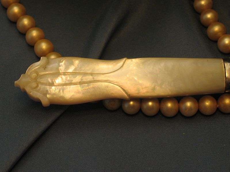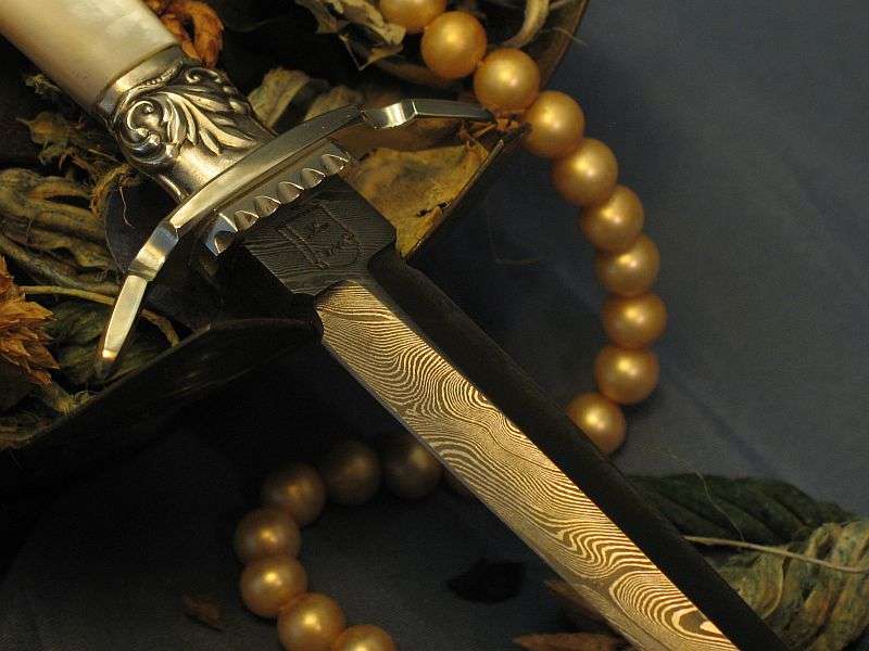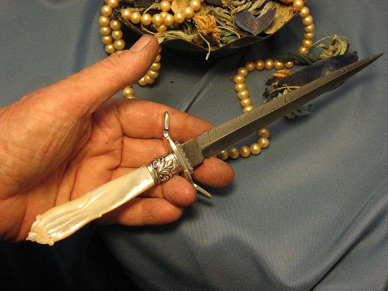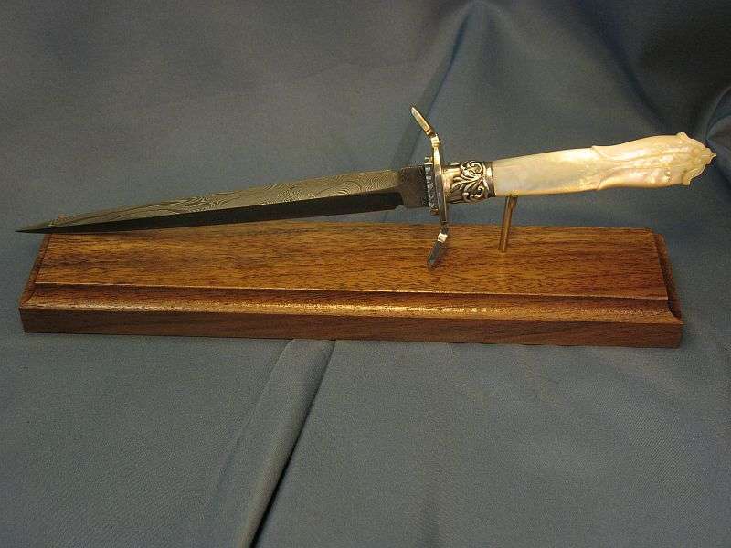 This is a dagger with carved mother of pearl, sterling silver ferrule, nickel silver guard and my Damascus of 10884 fine grain from Aldo Bruno and 15N20. Was really pleased with the way the Damascus turned out. Has a needle point. Sharpened. Blade length is 6 3/4 inches and overall length is 10 3/4 inches. My hardest grind. Comes with a black walnut stand. SOLD and 8.00 priority mail in USA but can ship anywhere that is legal for cost of shipping. My e-mail and paypal is dangraves4923@earthlink.net Hope you like it as I enjoyed making it.