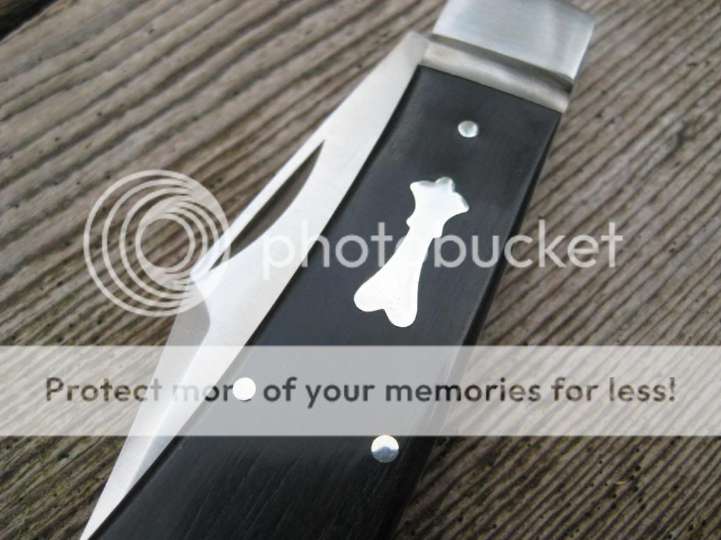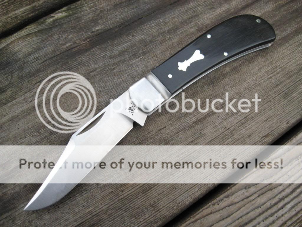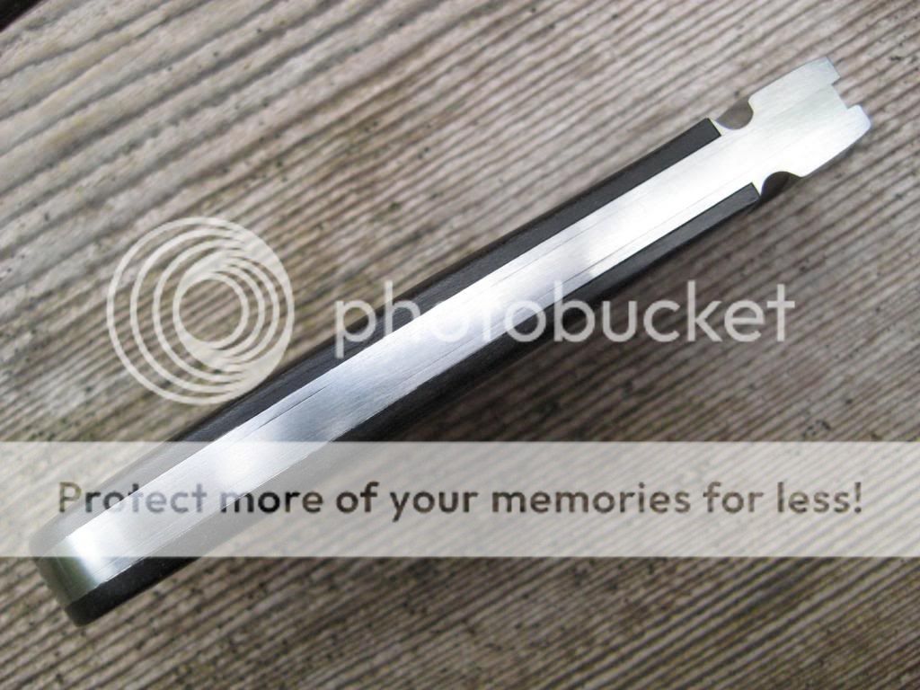 So, this knife is less than perfect. The scale replacement is better than it was, but still shows some dishing around the shield/bolster area. It is difficult to see in the photos, but it is there. The fit where the bolster meets the scales is also less-that-perfect as seen in photo, but it isn't as noticable in hand. There is also a tiny 'roll' in the frame/spring junction as shown in the photo of the back of the knife. All in all, the knife is functionally perfect, but somewhat less than a safe queen. Still, it has the milled frame and bolster and 154CM blade steel as well as Tony's awesome grind, and has pinned on shield and nice black ebony.