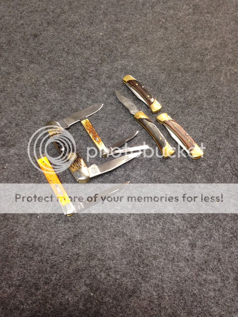JDieseljoe69 Full Throttle Tools Gold Member Feedback: +384 / =0 / -1 Joined Mar 16, 2010 Messages 3,707 Mar 14, 2014 #1 Up for sale is 6 knives, being sold together. All in great shape, I dont believe I have the boxes, but I can check. 3 Buck 055 knives Remington Muskrat I believe, not sure Case Doctor's knife Case Baby Doc Looking for $145 shipped I can send better pics if needed JDieseljoe69 at aol.com is my email