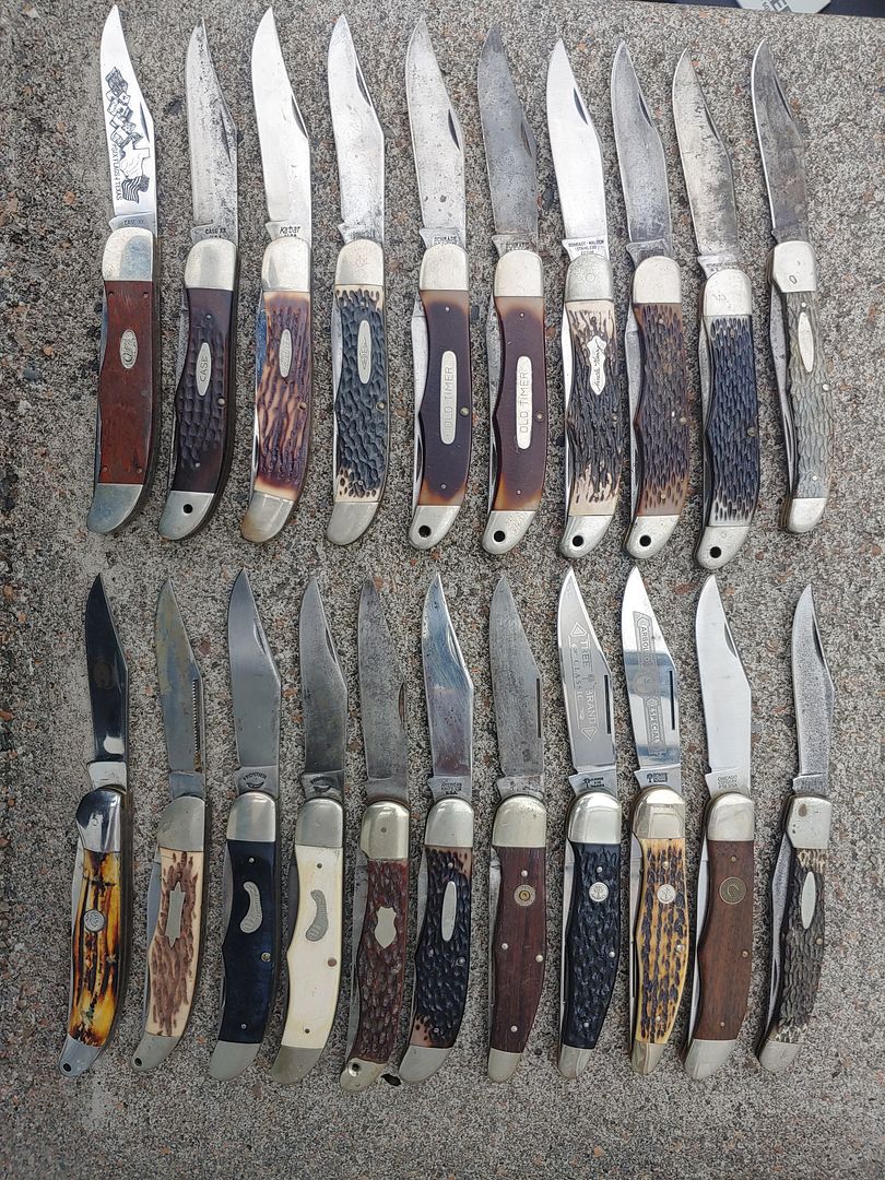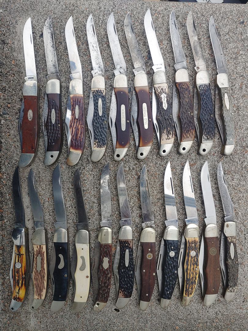 Top row, left to right: Case FFG, Case SAB, Kabar, Imperial Diamond edge, Schrade OldTimers, Schrade Uncle Henry, Schrade Waldens, Western.