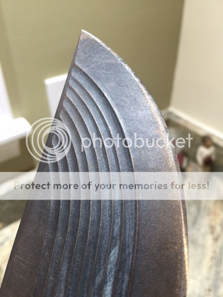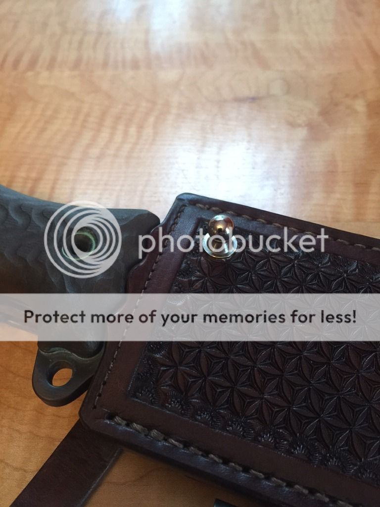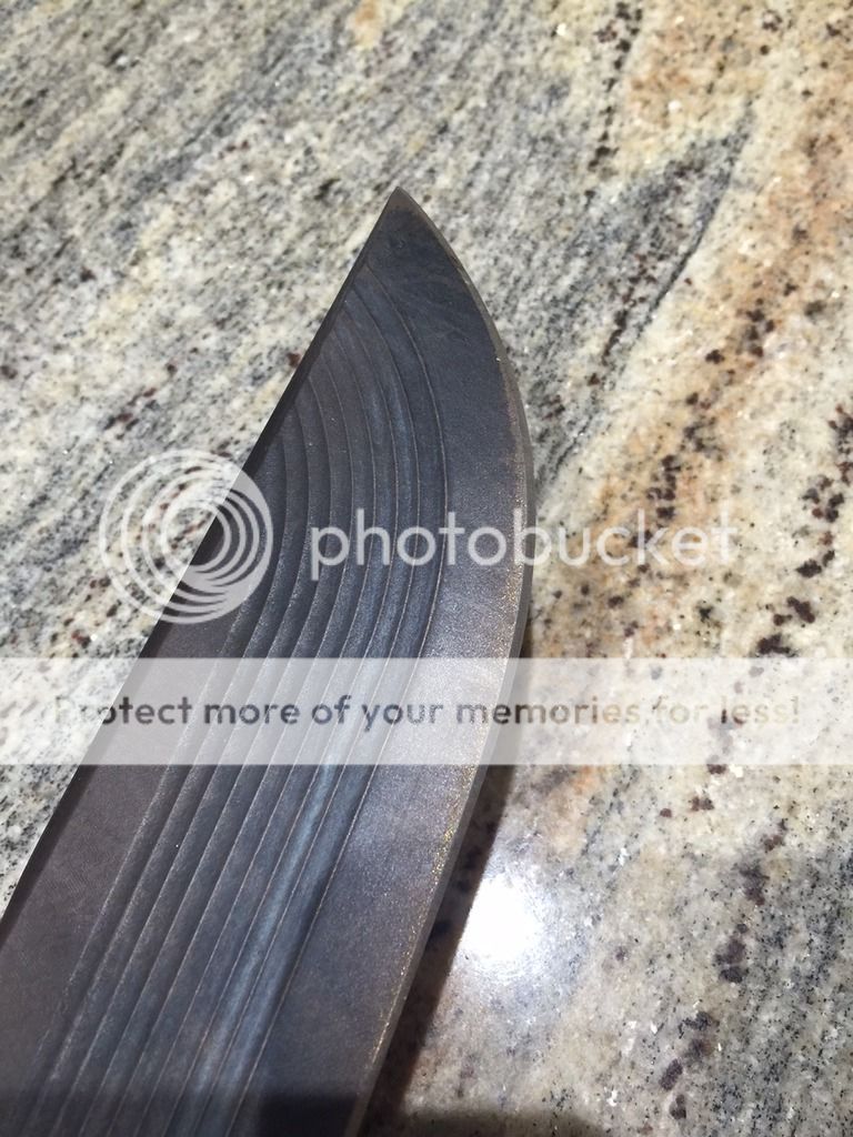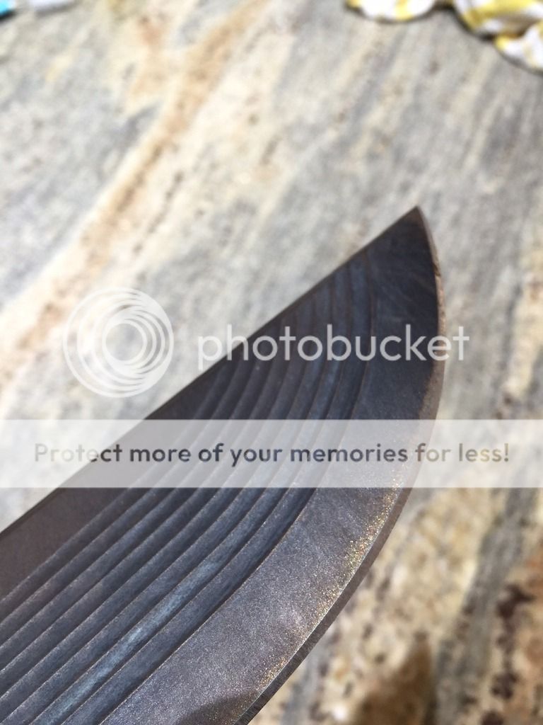 I just got my Bronze CGFBM back from knifeleather, who was nice enough to make my blade some new pants, so I decided to give her a light workout by chopping some Willow Oak I've had sitting around for a while. The CGFBM chops like a dream! After chopping for a little bit it appears that the bronze Cerakote is giving way to a gold base layer. Unfortunately, my pics are not of the greatest quality, but hopefully you can the idea from the pics. I'm very happy with both the blade and the sheath!