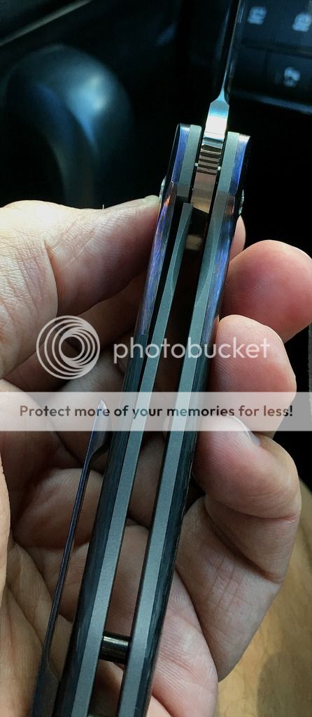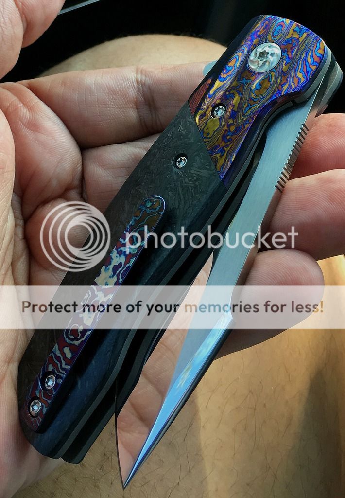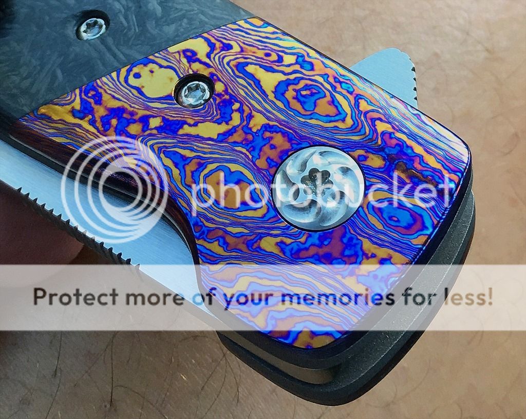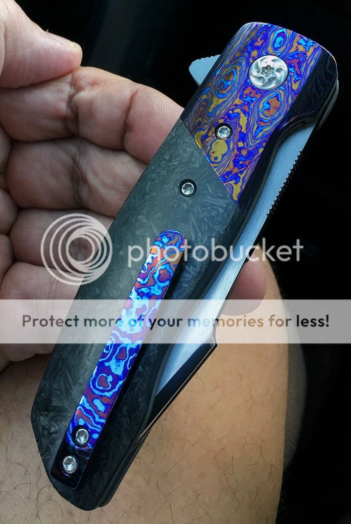 The timascus bolsters are, as I think you can see, pretty exceptional. The colors and detail are off the charts. The scales are smooth, contoured shredded carbon fiber. The pivot is his own custom vortex.