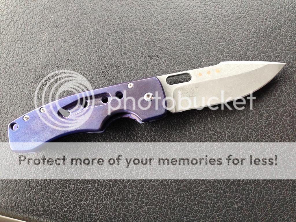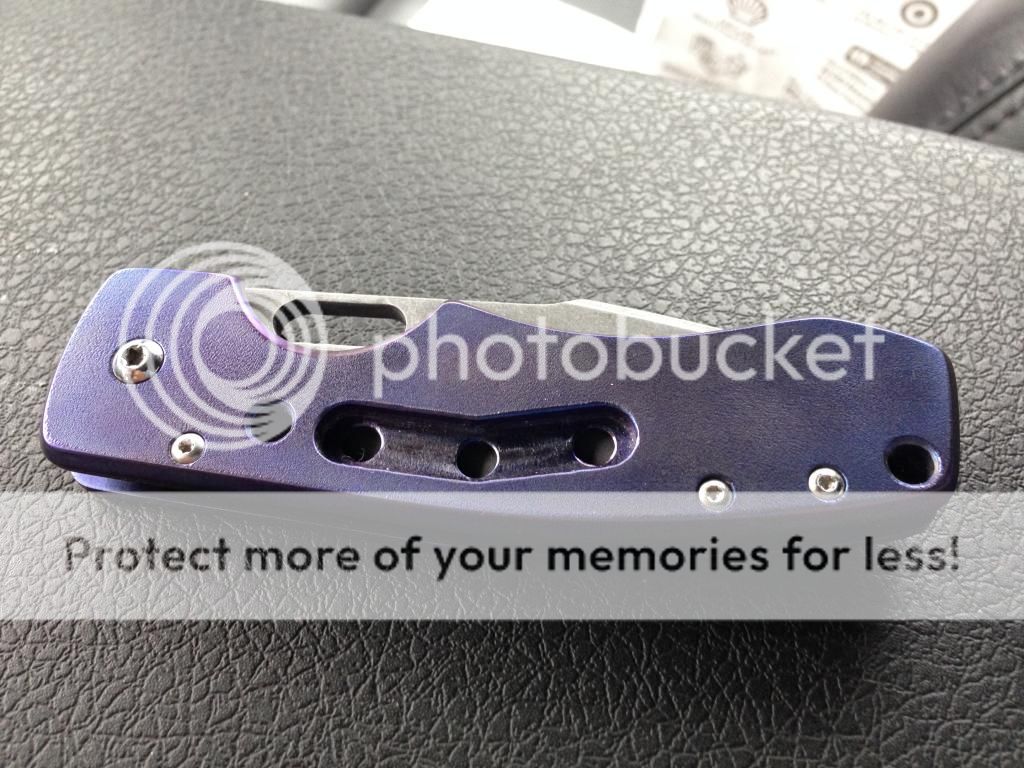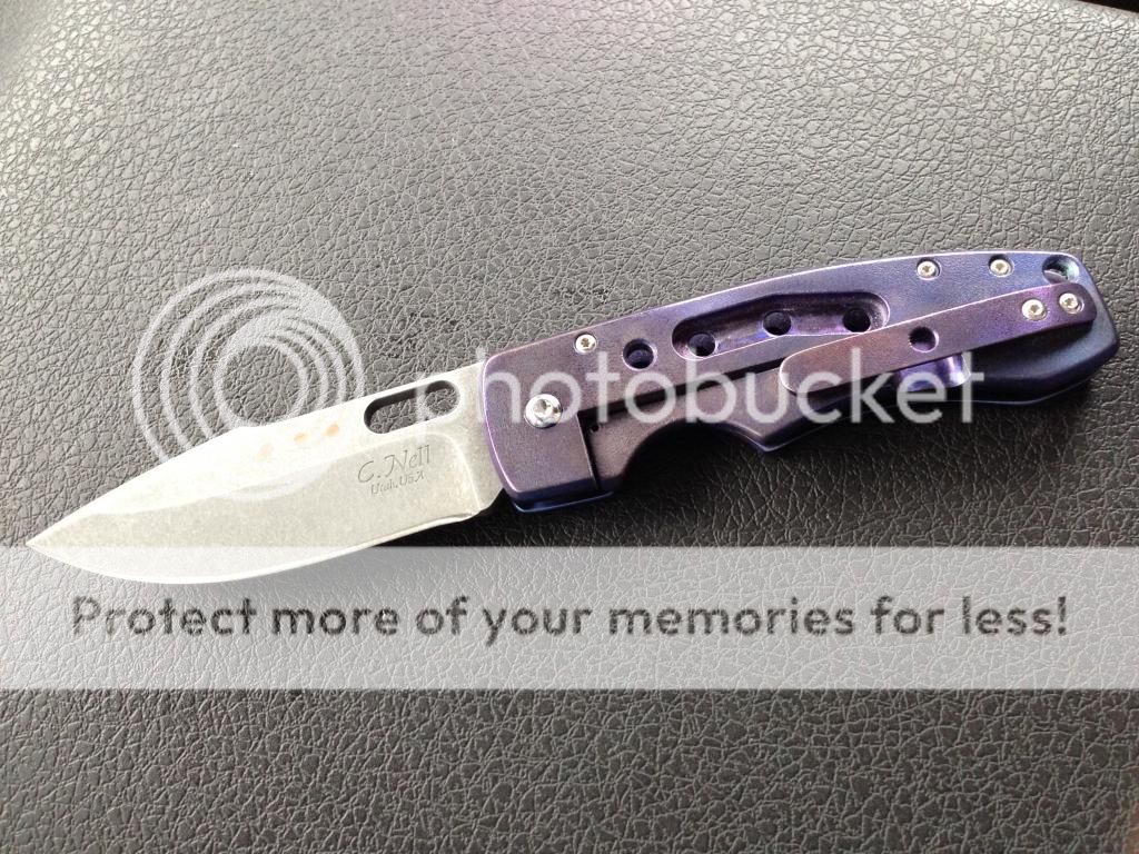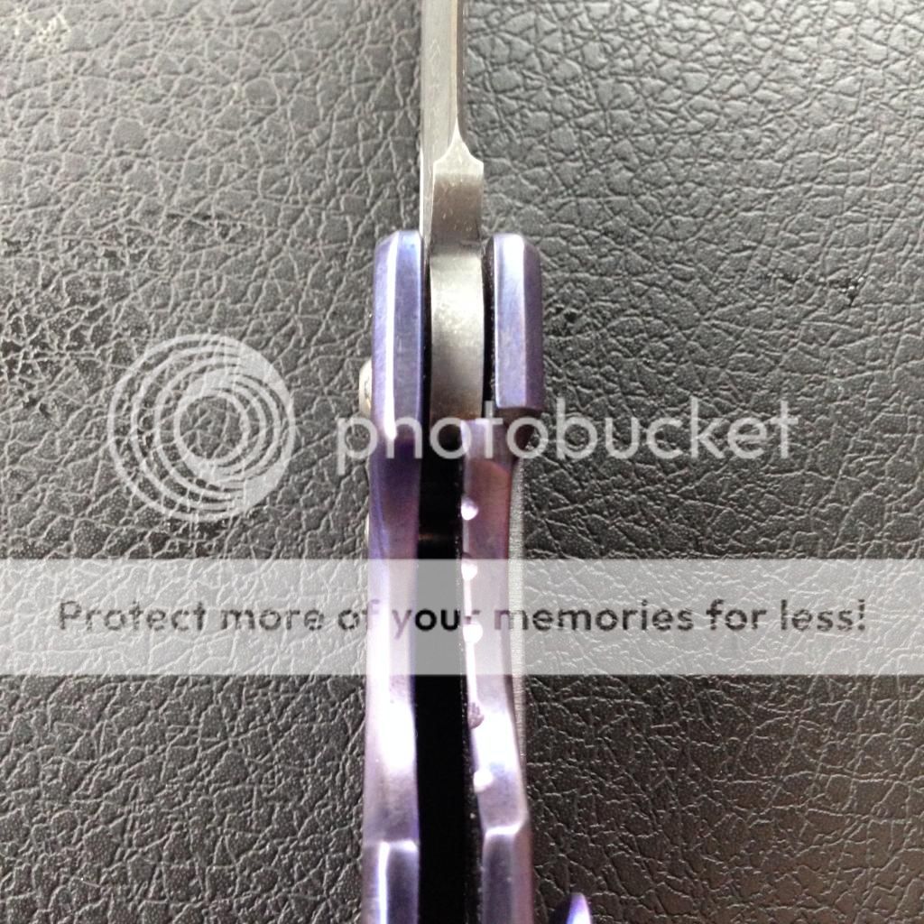 I hate to let this go, but I've got upcoming orders (including another one from Chad Nell). This is Chad's Templar model. 3.25" CPM 154 blade with an acid stonewash and copper inlays in the blade. All Ti frame lock with purple/blue anodizing and decorative milling and hole pattern. The knife rides on bearings for super smooth and fast action. Lock up is solid with no wiggle at about 40%.