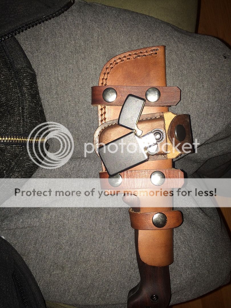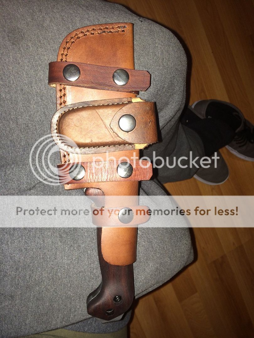 So i am not sure about the rules and regulations here. If this is out of line delete it please. I have been searching for a budget sheath. I have a becker bk2. I decked her out with tommys scales. Beautiful by the way. As for the sheath i dont have the money or leverage with the wife to buy a nice patriot leather or sedgwood sheath. I wanted leather it compliments the natural wood scales. So i went to the bay. The blade seems to be 1 3/4" wide obviously 1/4" thick and 5 1/4" long. With these dimensions i found a few nice scout carry sheaths around $25 shipped. I am not going to say it is high quality but it is nice. Not really heavy and in no way over built. I actually split some of the threading at the bottom trying to get the handle in a little. That sucked but lesson learned. This thing works and for the money i couldnt ask for much more. If it last a few months i will be more than happy. I am saving and buying the wife and my newborn daughter some stuff so by the time this thing gives. I will have enougha leverage to get a real sheath. Made for my knife. For the time being this is what i have. Sorry for rambling.
