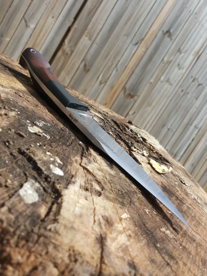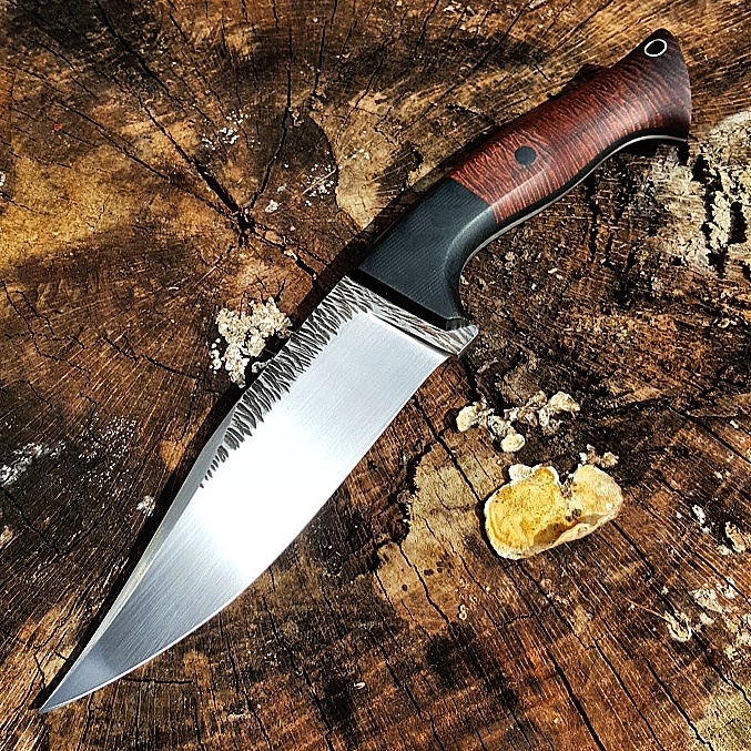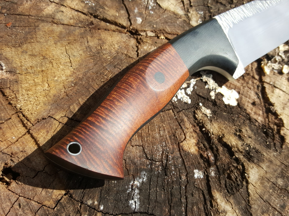 I am very proud to announce that Chris has decided to graduate from the Fiddleback Forge Apprentice Program. Once one of my apprentices can consistently make knives as good as mine or better I tell them that when they are ready they can make a graduation knife. When they present me with this knife I announce that they have graduated my program. Chris has been with me for over a year, and his skills have grown immensely during this time. His blade finishes, handle shapes, and his designs have all become top notch. I'm very very proud to say that the knife Chris submitted to me this morning is as good, and maybe even better than I could have done it. He is a gifted craftsman.