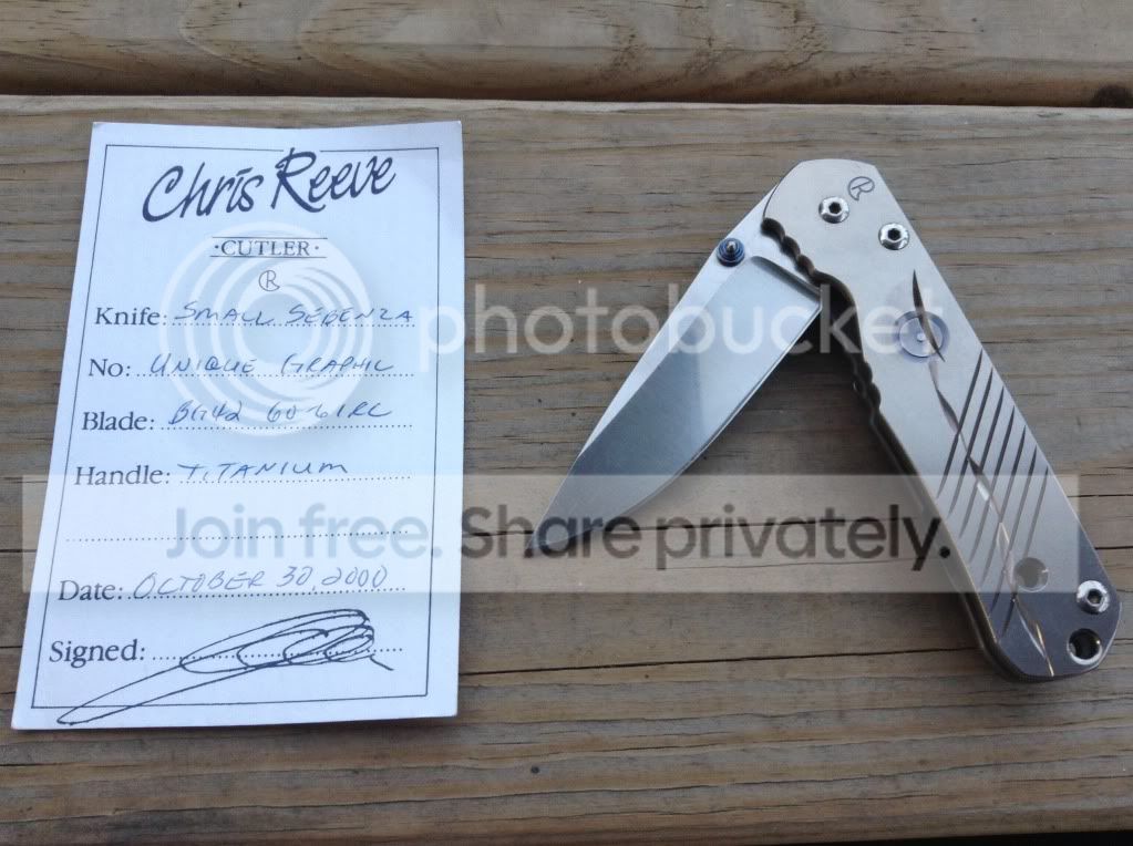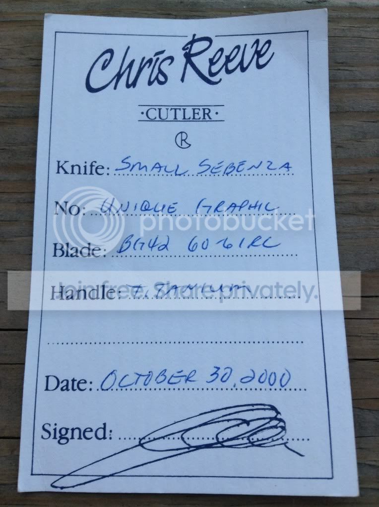( Halloween Eve )....lol. I do not have the original box, only the small regular UG sebenza and its Original BD card. Small regulars are hard to find, especially older UG's. Lockup% is about 75-80%, and locks up tight, No Blade Play in any direction. Blade is perfectly centered.