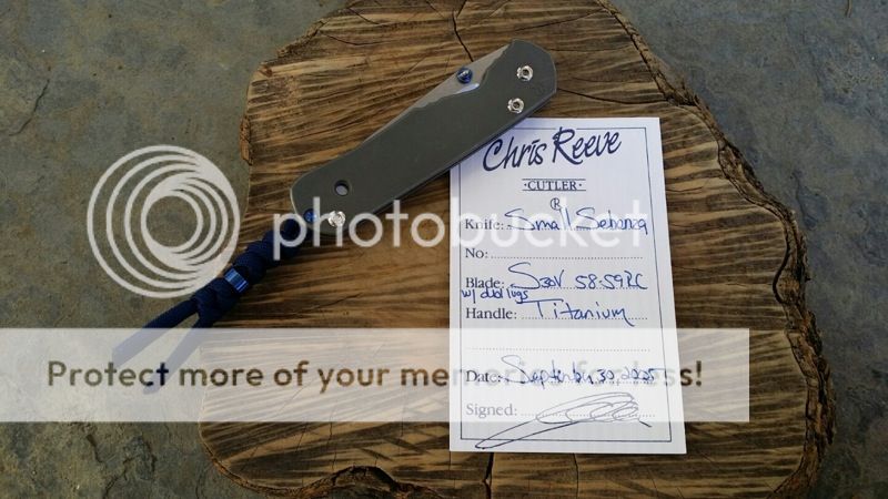 Next up is a Chris Reeve Small Regular Sebenza with dual thumb studs. This knife has been carried and has some marks on the Titanium slabs and clip. The blade look in excellent condition with minimal use if at all. This knife comes with a fancy CRK lanyard and bead. Lockup is rock solid and the blade appears centered. This knife was born 9/30/05. Box, birthcard, tool, and all paperwork is included.