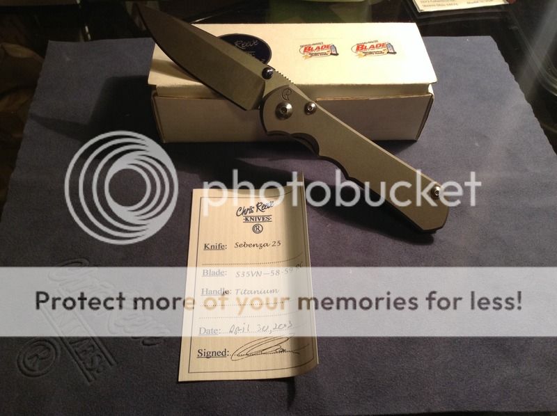 Sebenza 25- was a light user, but recently got sent into the spa. Looks new now, minus a few hairline marks on blade(could be irregularities from stonewash?) and the blue anodizing has worn. Early lockup for a 25 and perfect centering. Comes with box, cloth, birth card, tools. Price is $375 net via paypal (gift or $386.51 goods/services) This includes free insured shipping anywhere in Canada or USA.