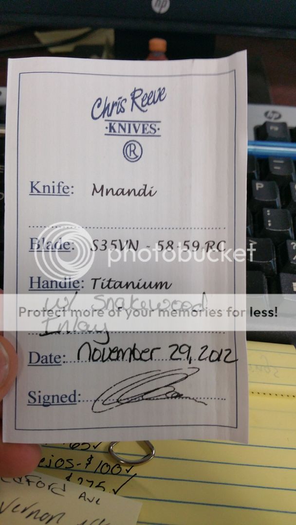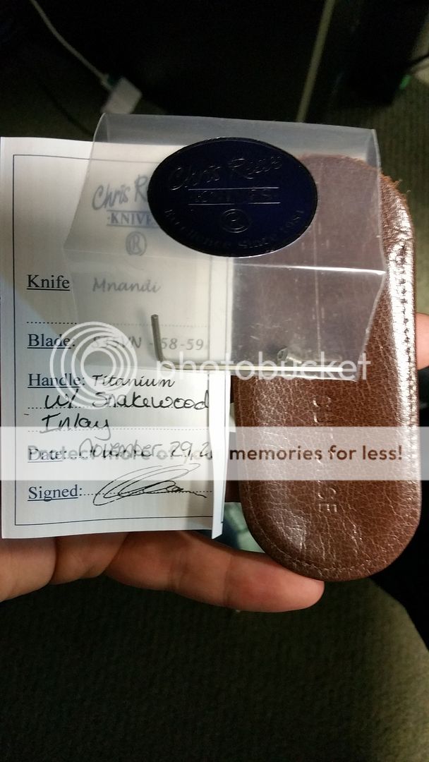 Catch and release: I also have a snakewood Mnandi. Just recently had the inlays replaced and the spa treatment performed. Comes with box, birth card, towel, tools and sheath.