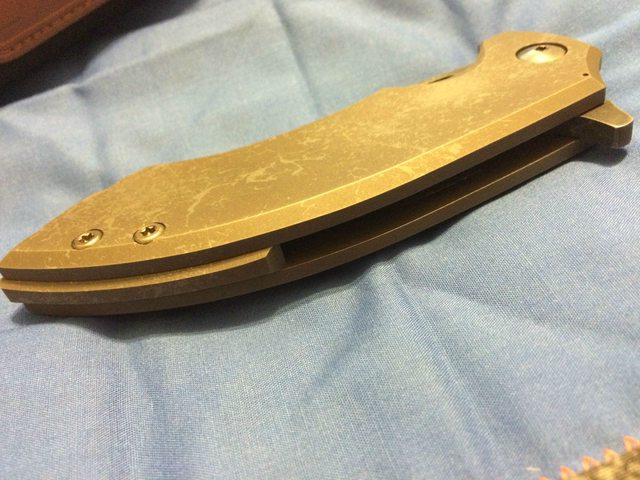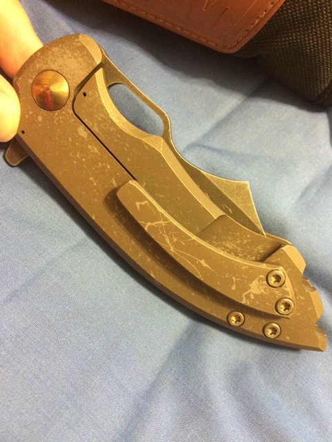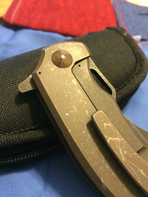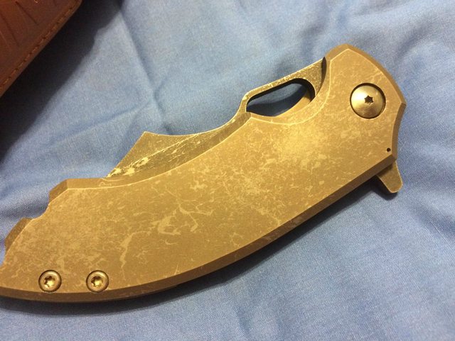 Handle: Titanium framelock, with titanium backspacer, "Splatter" finish on scales and blade