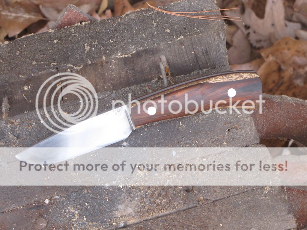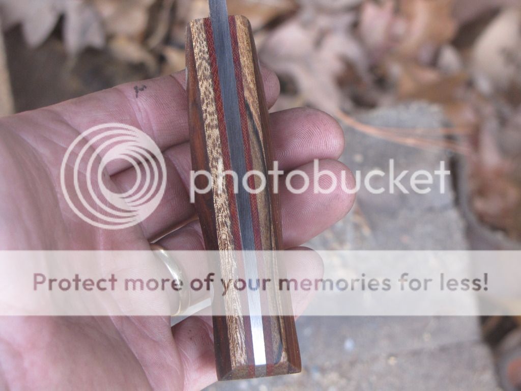 Here is an EDC/Hunter forged out of W2. The blade is 3 1/2", polished to 1500-grit and etched to show the Hamon. The handle is 3 7/8" with 1/8" Natural Micarta, New Guinea Walnut, and Cocobolo laminated together and stainless corby bolts. Does not have a sheath.