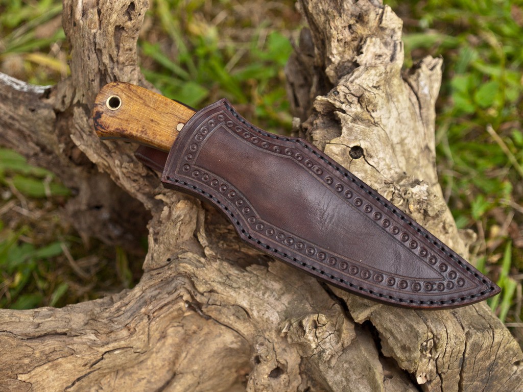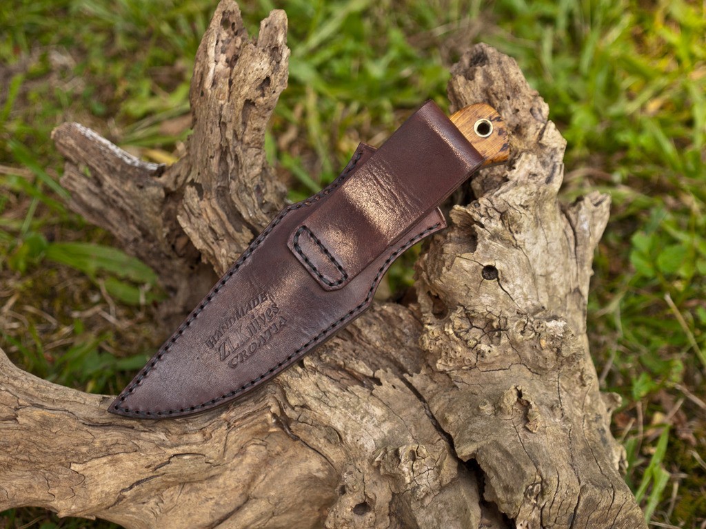 Brown leather sheath is included
