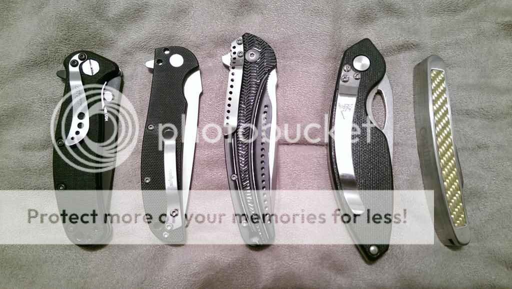 Other than the condition issues with the zing tanto pivot and the wear on the buck all the others are in very good used condition. Now on to the pics.
