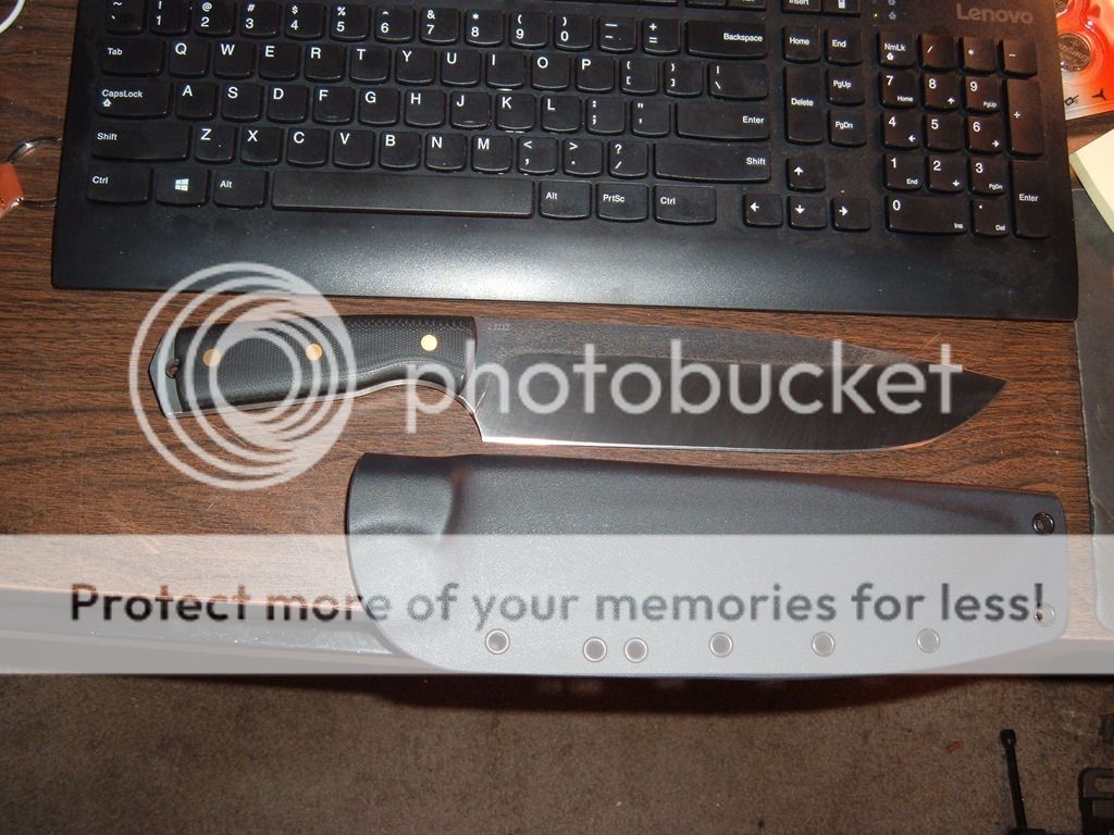 Been having fun playing with variations on this theme. This one is 14in overall with an 8 7/8in blade tip to point. The blade is 2in wide at it's widest section. Made from 1/4in thick 5160 with a differentially hardened blade. Scales are black G10 with peened over 3/16 brass pins. I left the mill scale on the flats. Bevels are flat ground. Includes a black Kydex sheath that will fit a large size Tek Lok(not included). Price is $275 ***sold***shipped in the US(Paypal or USPS MO).