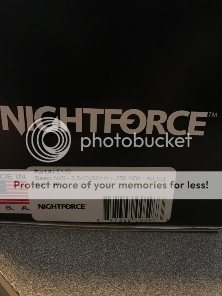 I have for sale a NightForce NXS 2.5x - 10 X 32mm scope that is currently mounted in a LaRue Tactical SPR / M4 Scope Mount QD LT104 (couple small handling marks on the Larue Mount). This was purchased from an authorized dealer and professionally mounted on a Sig 556 Rifle in 2014, shot about 100-ish rounds, went in the safe and never saw the light of day again (I have another identical Nightforce). For those of you in the know, optics do not get much better or rugged than NightForce, ask the US Special Forces community. This unit is pristine. (Edit) I see a small minor scuff on the top turret cover where it rested against the safe wall, the glass is as perfect as the day that it arrived including the box and paperwork (Lifetime Warranty).