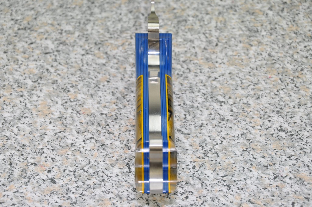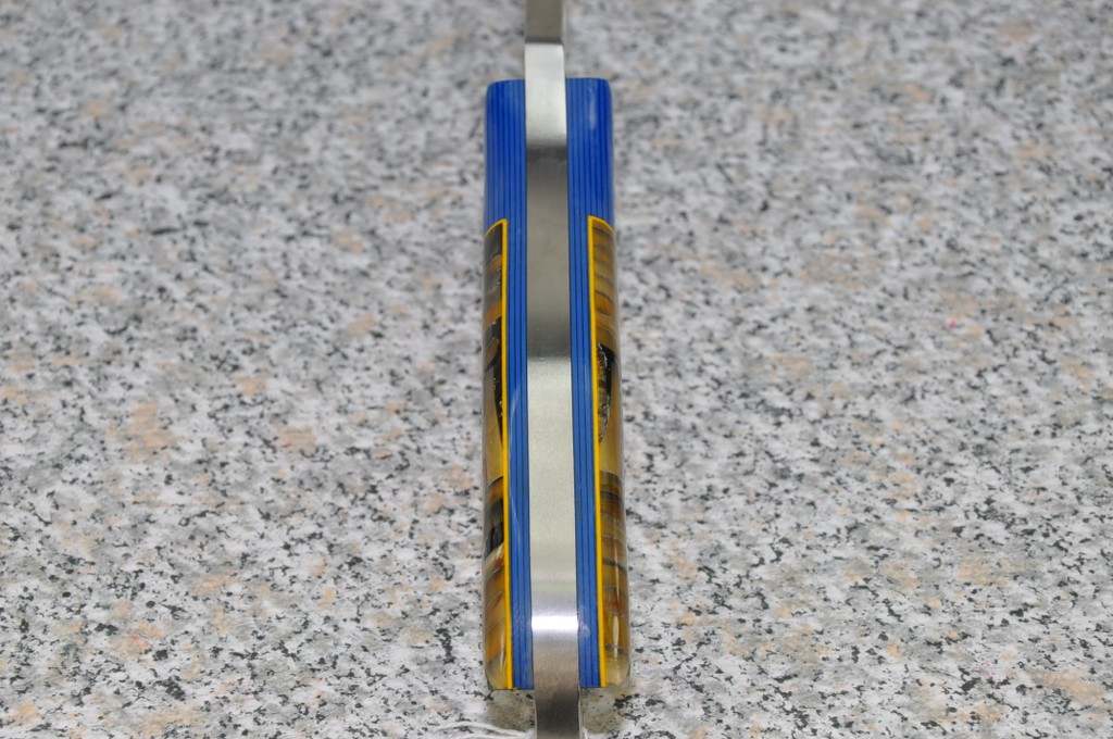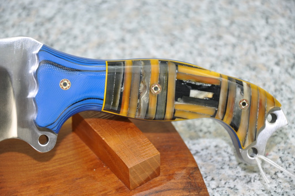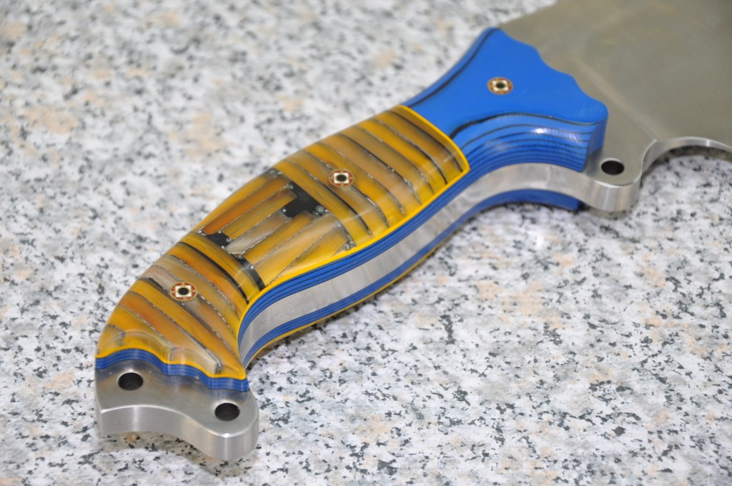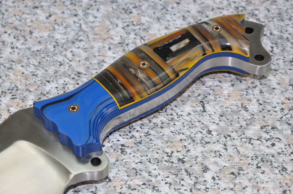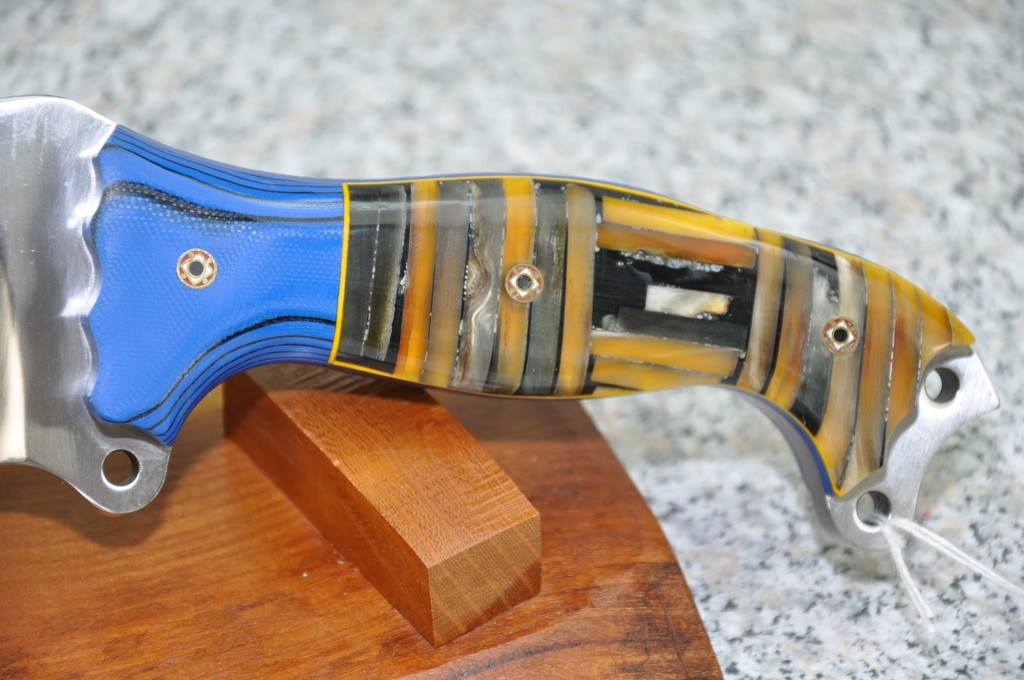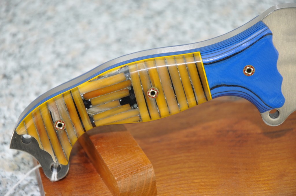 Handle Material is GREX with BLUE & BLACK G10 and STACKED BONE & MAMMOTH (horizontally and vertically) outlined in Yellow assembled with MOSAIC PINS!