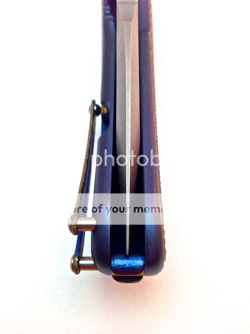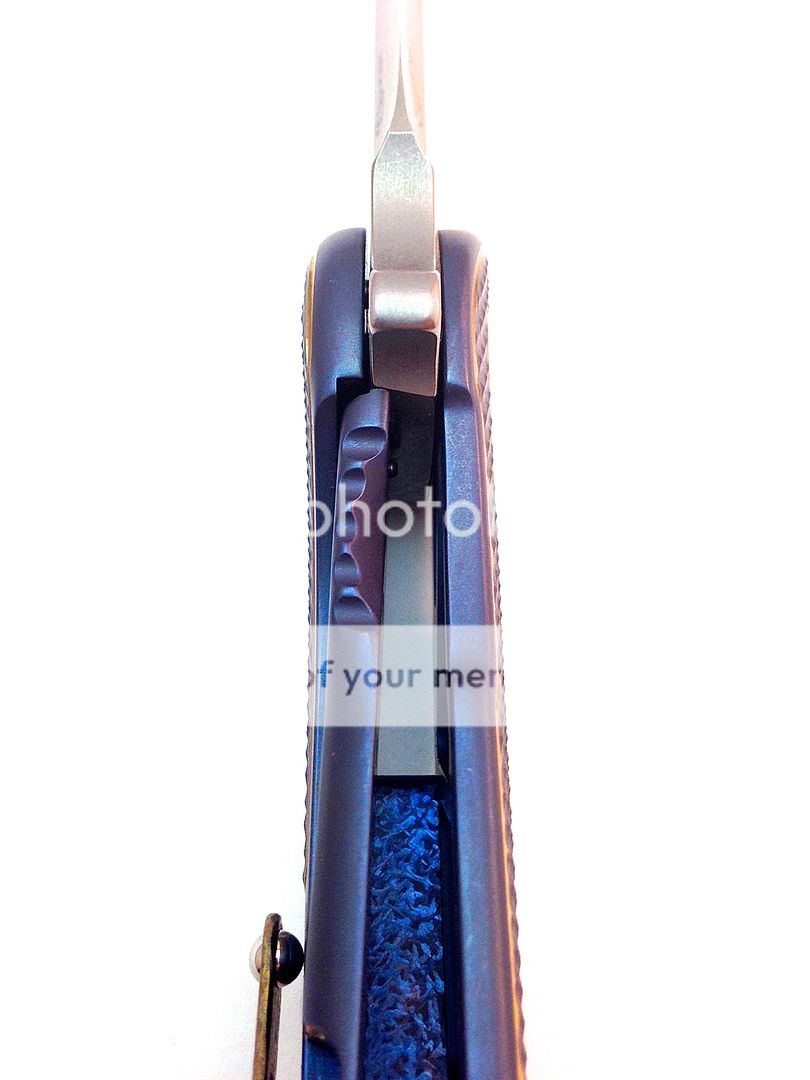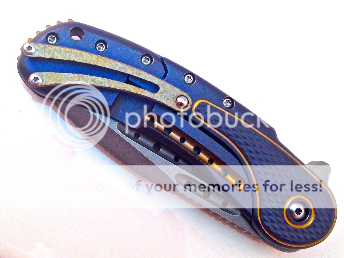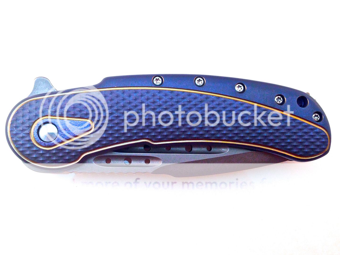 **Handle: Full Titanium. Not an inlay but the Diamond texture is milled directly into the Titanium. Dueled Anodized, All bead blasted, then anodized in blue and polished off the textured part to give it the shinny appearance then re-anodized it in gold. Milled pockets of the titanium to make the knife a little bit lighter.