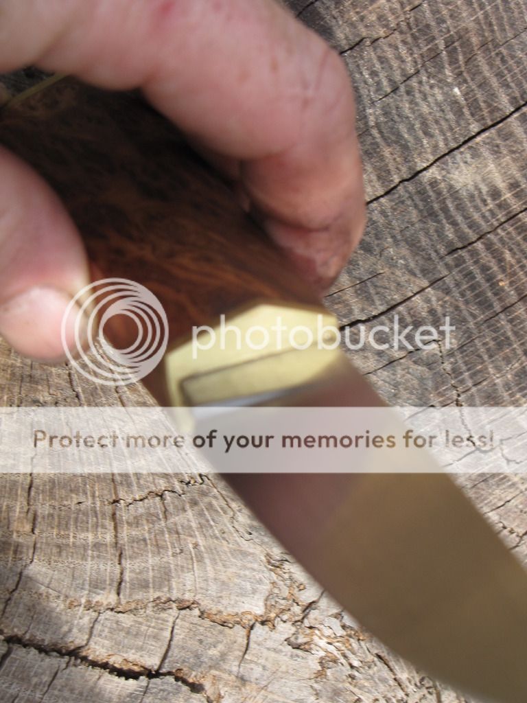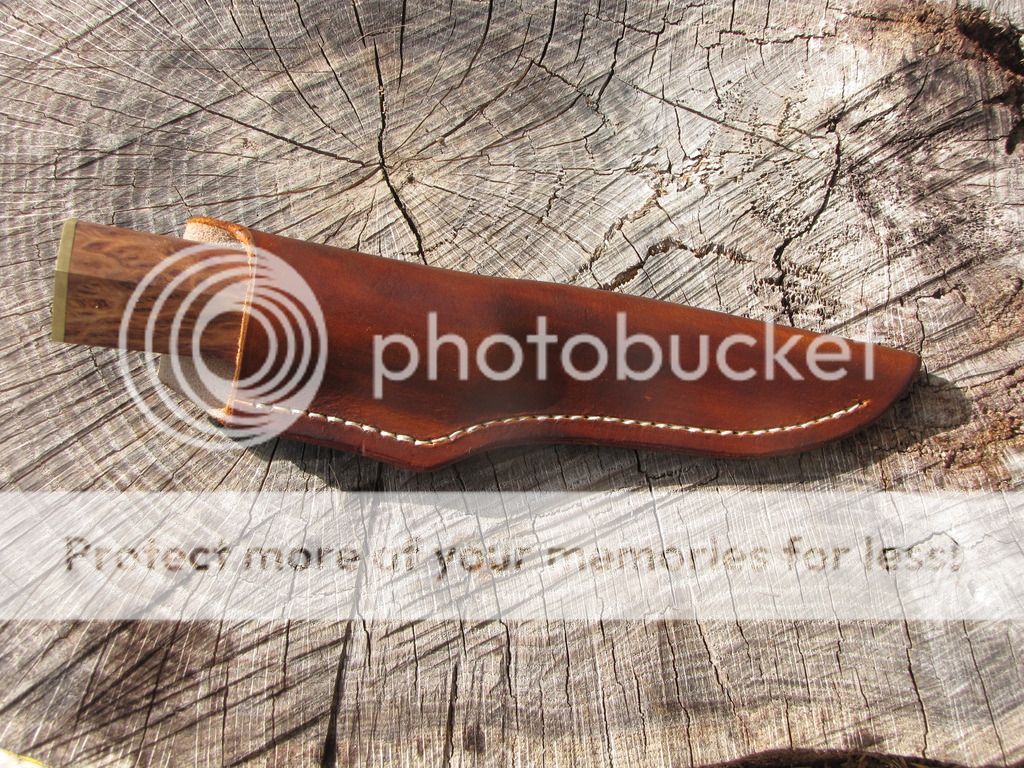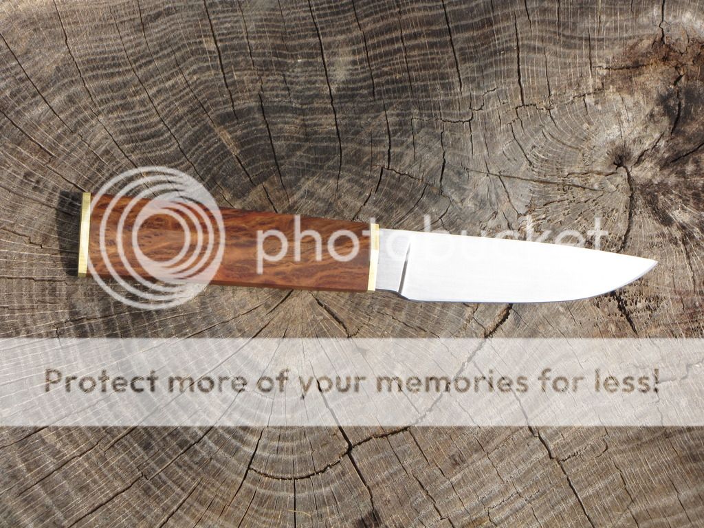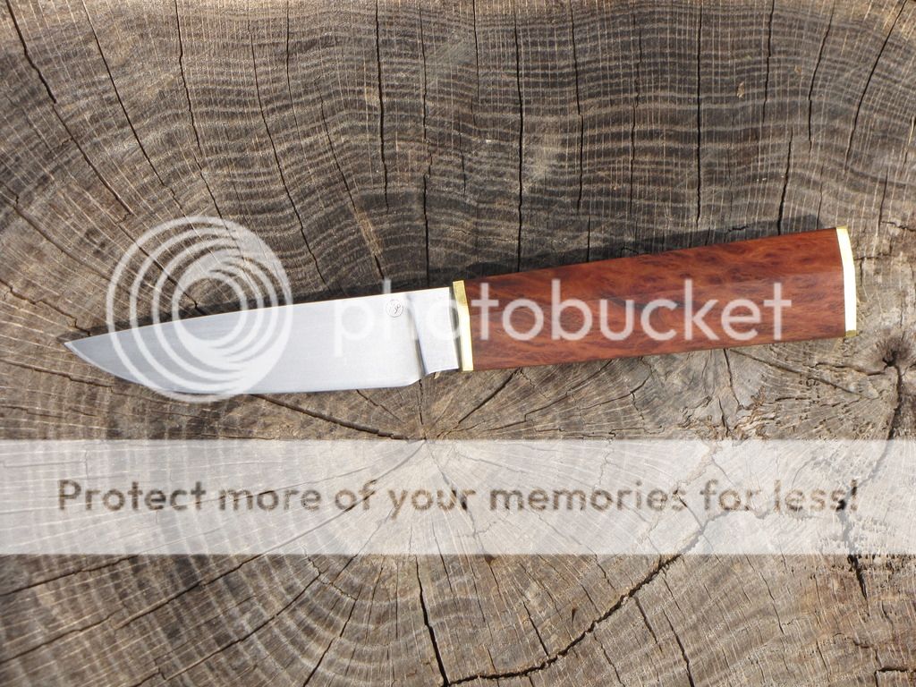 Here is a Coffin-Handled Puukko forged from 3/16" 52100. Blade is 4 1/4" with a nice distal taper. Hand sanded to 400 grit. Heat treated to 58-59 RC. Handle is 4 3/8" with stabilized Red Coolibah Burl. Its tang extends all the way through the handle and the cap is threaded onto the tang. Handle shape is surprisingly comfortable to the hand. Comes with leather sheath.