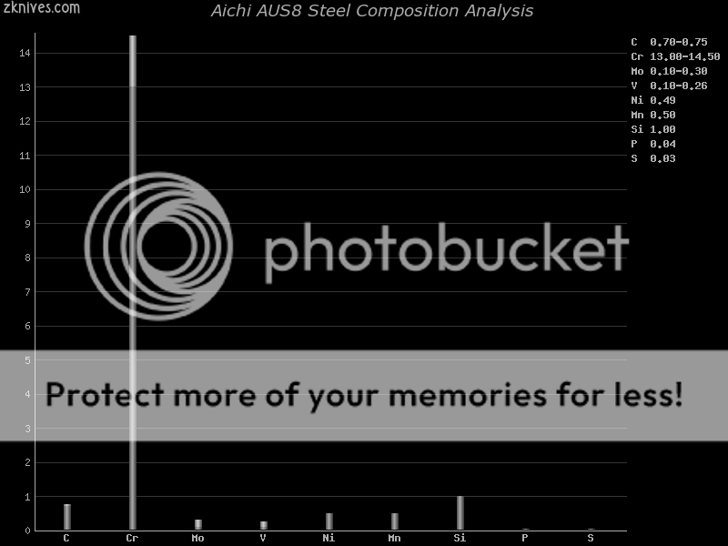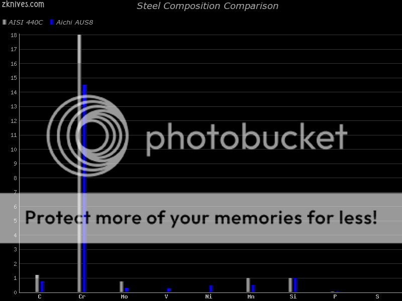 You will also note that AUS8 also has much more Molybdenum in the matrix of the steel, which aids in making carbides, and allows Chromium to function more efficiently at preventing corrosion, since Chromium that is held in the carbides of the steel