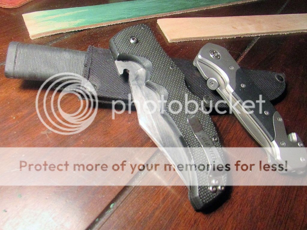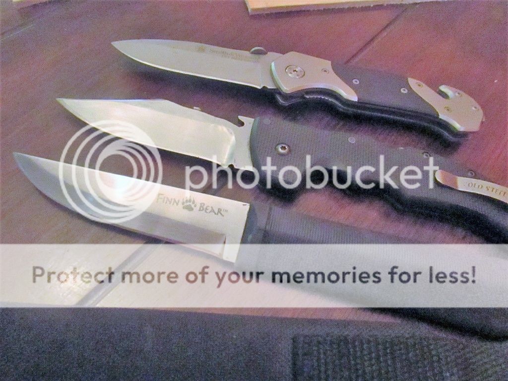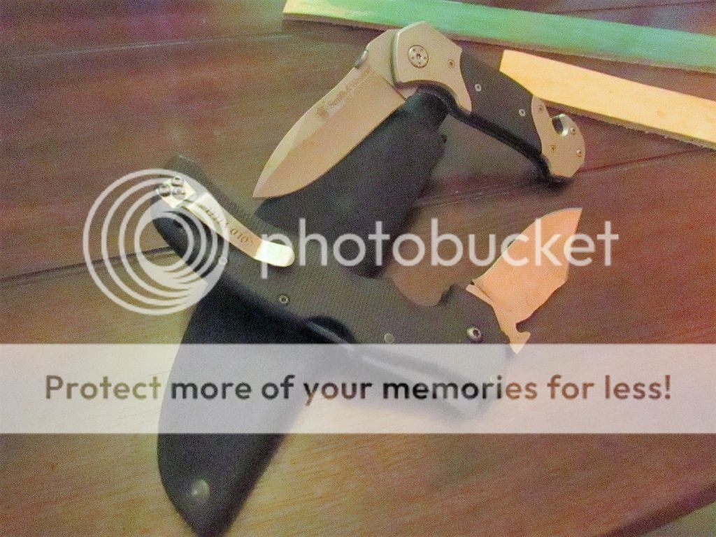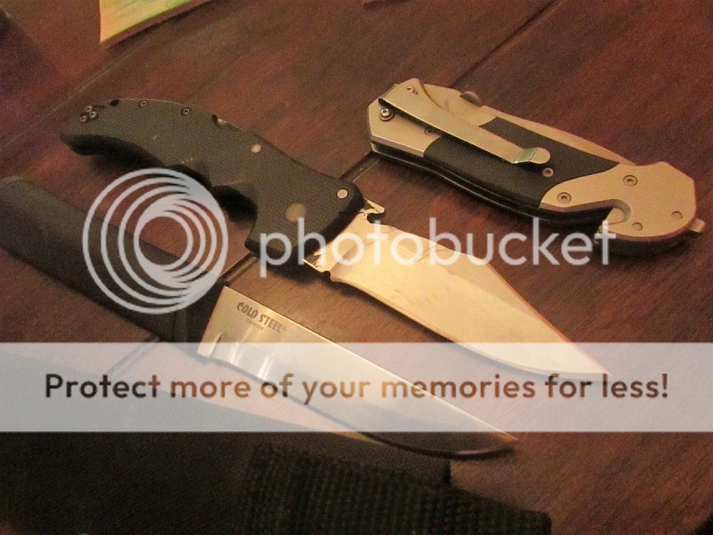 Cold Steel Recon1- This has been my EDC for years. Many scratches on blade.One heck of a knife, long ago I dremeled out a wave which can be seen in the pictures. The wave works perfectly, and was the only knife I would carry when I couldn't have my CCW on me. It'll be missed. Interests change. Typical tri-ad lock up. Will ship with a fresh edge.