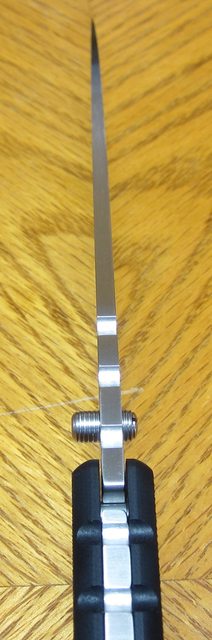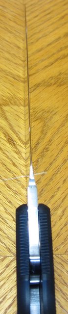 This knife is still distinctly its own though, the overall pattern is very clean, just a single rod of thick, grippy G-10 (.530" thick) and a beautiful distal taper full flat ground AUS-8 blade (.15" bladestock). The edge and tip are about average thickness for a folder (.020" to .025" thick at the shoulder), but given the size of this knife it makes the blade (especially the tip) much more delicate than you would find on your average knife this size.