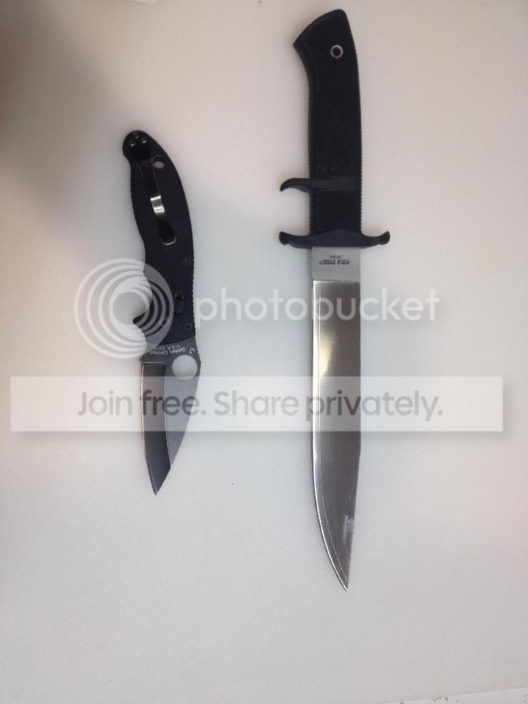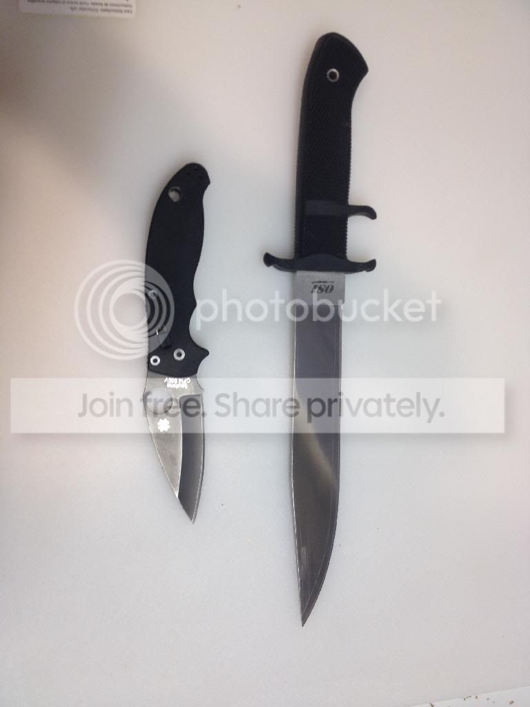 I have a Cold steel OSI in San Mai III ((GONE.)) It has some light scratches near the tip and has had the edge convexed, otherwise in very good shape. I also have a Manix 2 g-10 user, it has finish wear on the pocket clip as well as right where the grind starts, it appears to have happened in the sharpening process. It is hollow ground in S30V. I apologize for the terrible pics, if you want anything specific or zoomed in, shoot me an email and I will try to accommodate.