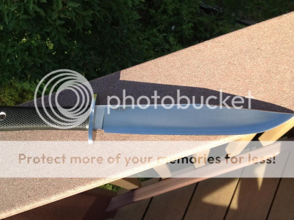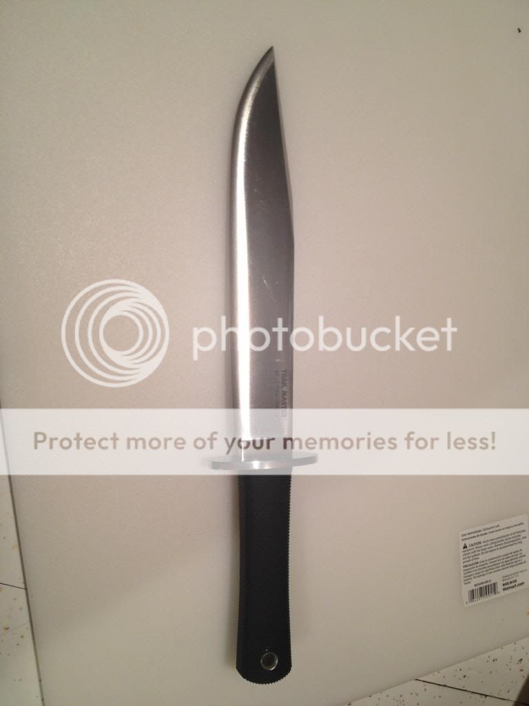 I have a Cold Steel Trail Master in San Mai III for sale. This is one of the newer models, I received it new within the last year. It has some light scratches as seen in the pictures (I will try to get some better outdoor pics tomorrow), never been sharpened, just stropped and is very sharp. Convexed grind and 5/16 thick. Comes with factory sheath. $190 shipped to your door. International sales only to those with substantial feedback and willing to pay the shipping difference. PM with any questions or comments.