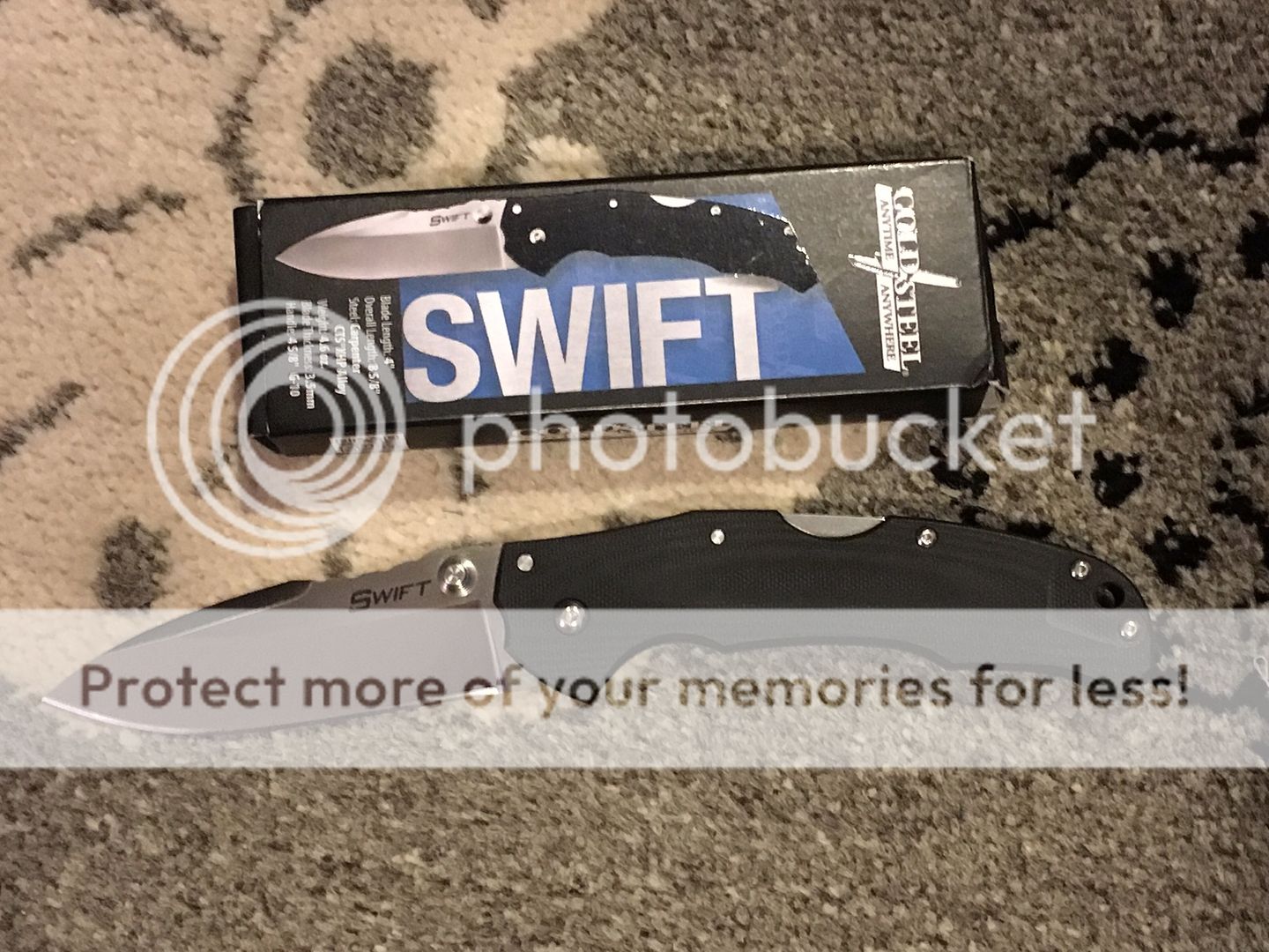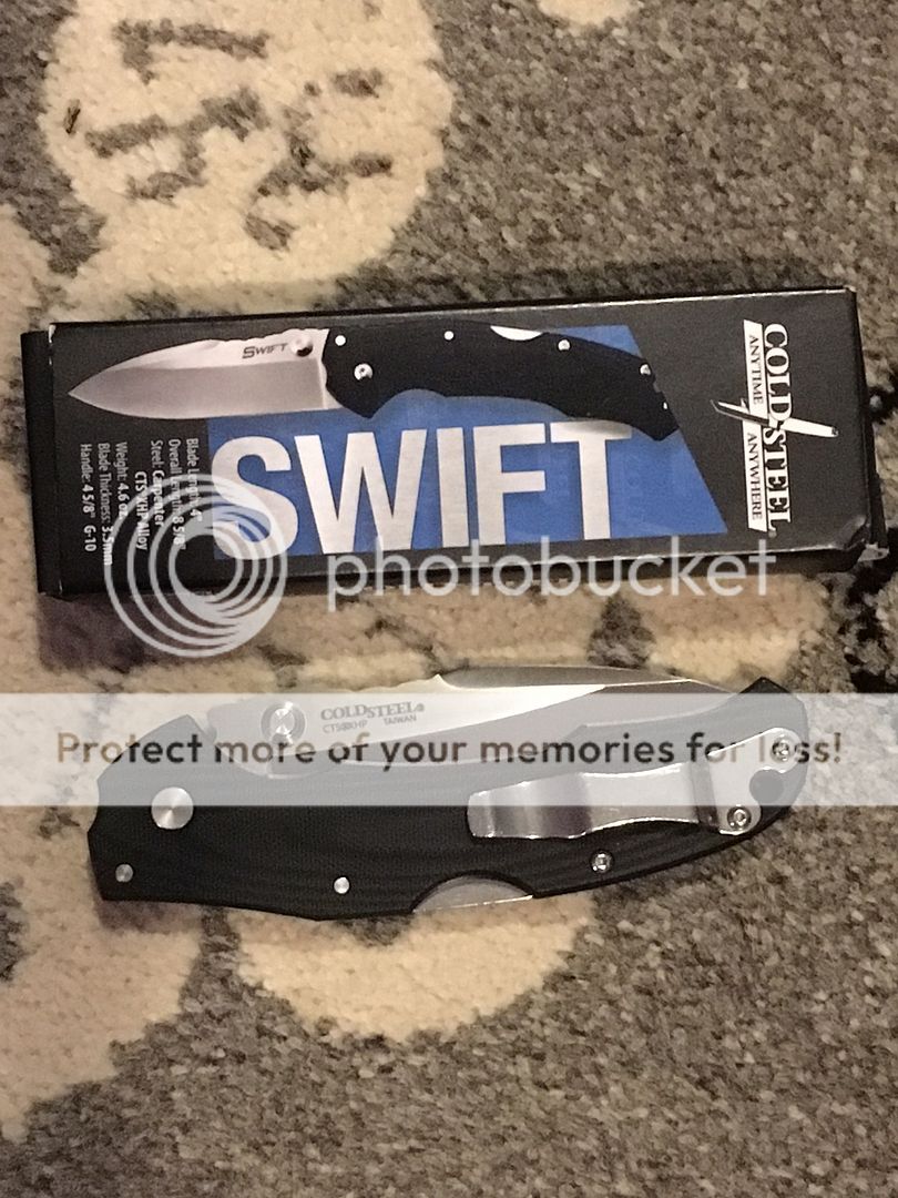 I have an assisted opening Cold Steel Swift I with CTS-XHP steel for sale. It has been carried a handful of times and was used to open packages. Still has the factory edge. Has a couple light scratches on the blade and some scratches on the pocket clip. Comes with box and new left hand carry pocket clip. Selling for SOLD (includes PayPal fees and shipping). Will only ship CONUS. First "I'll take it" with quick payment get's it. Not interested in trades. Thanks for looking.