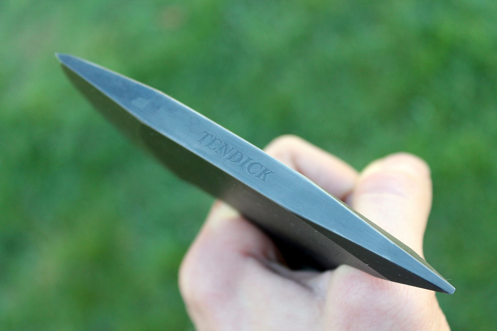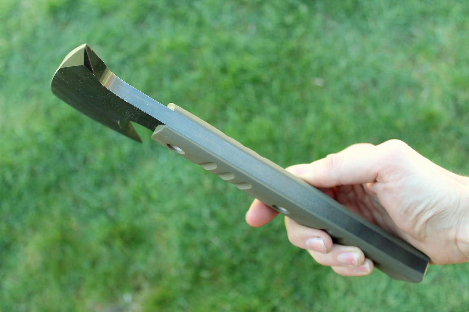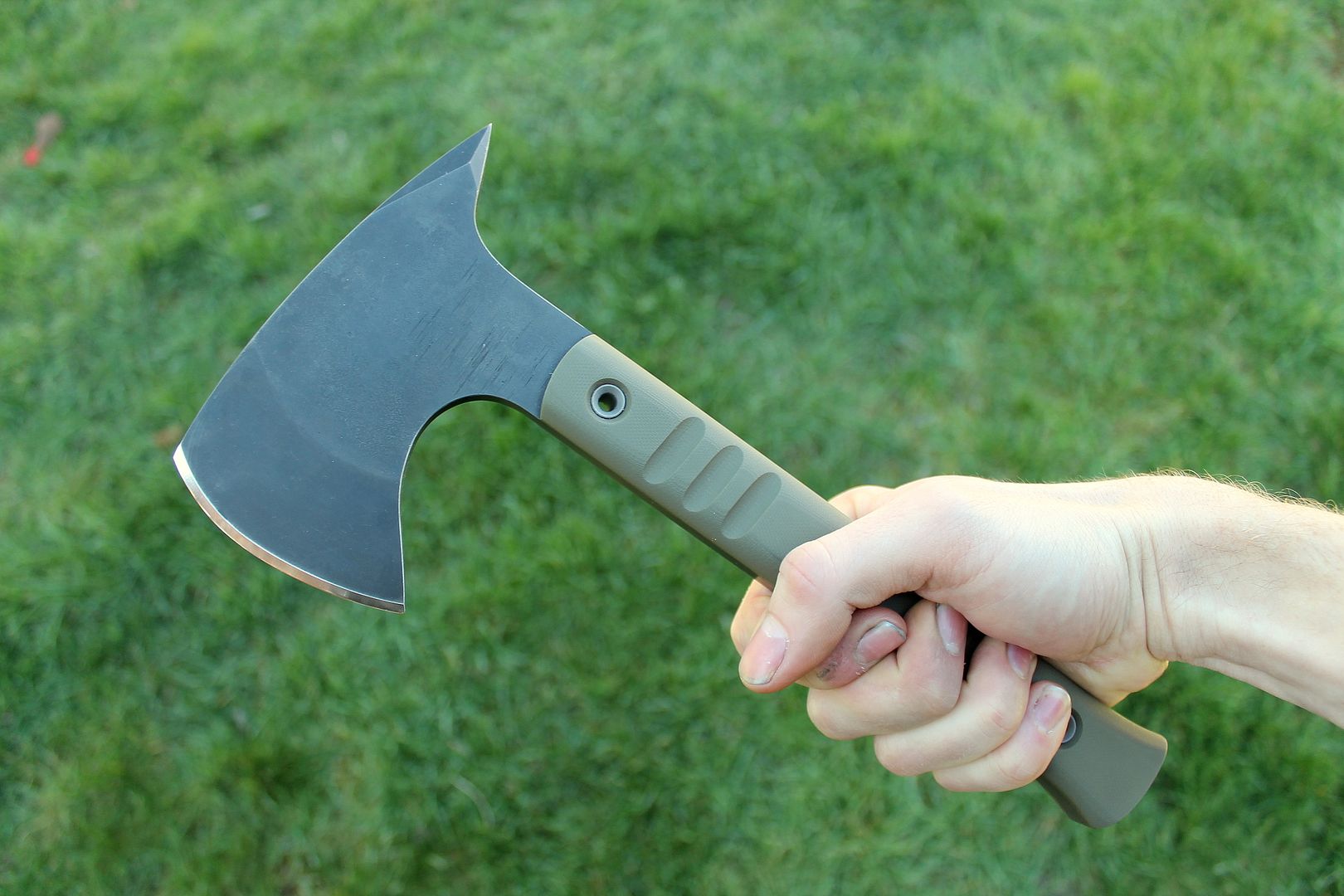 These are built with 3/8" 4140. They are through hardened and then I spring temper the tang for extra toughness. Although beefy, they are quite well balanced and pack a lot of punch. This one has OD green G10 scales, I did some different handle texturing on this one, pretty happy with the results. The scales are attached using both G/flex epoxy and flared stainless tubes.