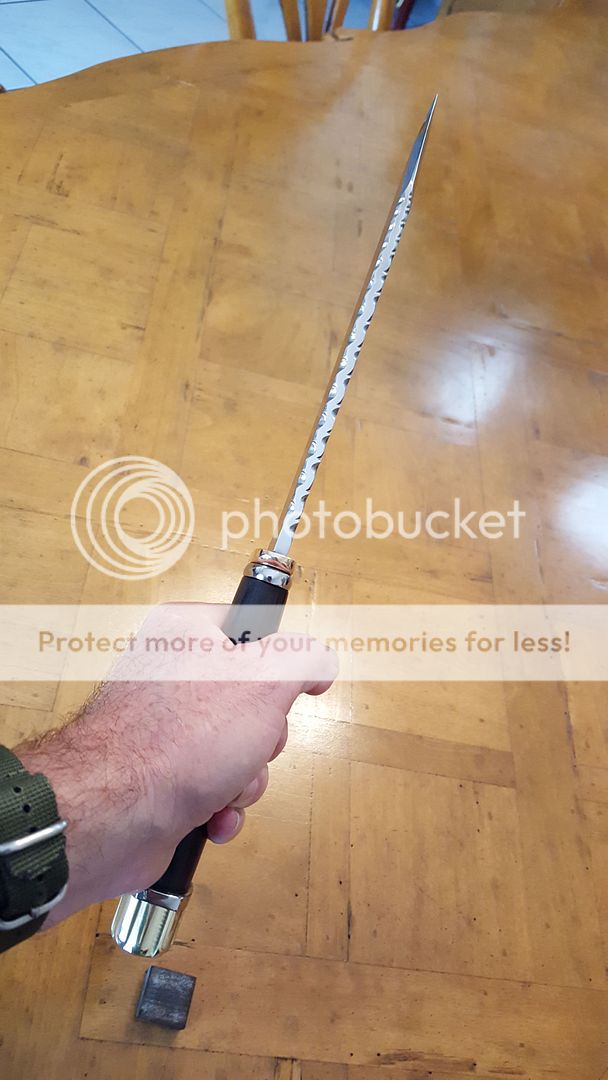 Ground on a 10-inch wheel both the blade and the upper swedge are razor sharp. Perhaps one of the nicest knives I have made to date. No wait thats wrong. The last wo pictures are of a Viking Saxe with a 9-inch blade. That is the nicest knife I have made to date. It is at the sheath makers now so it will show up for sale in a week or two. If you are interested drop me an IM or email to mongrelknives@gmail.com.
