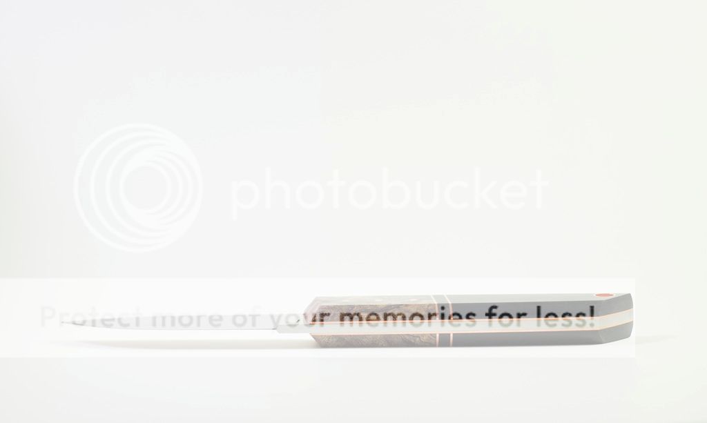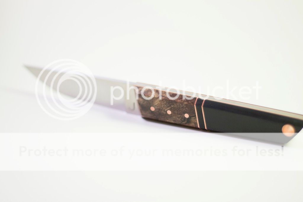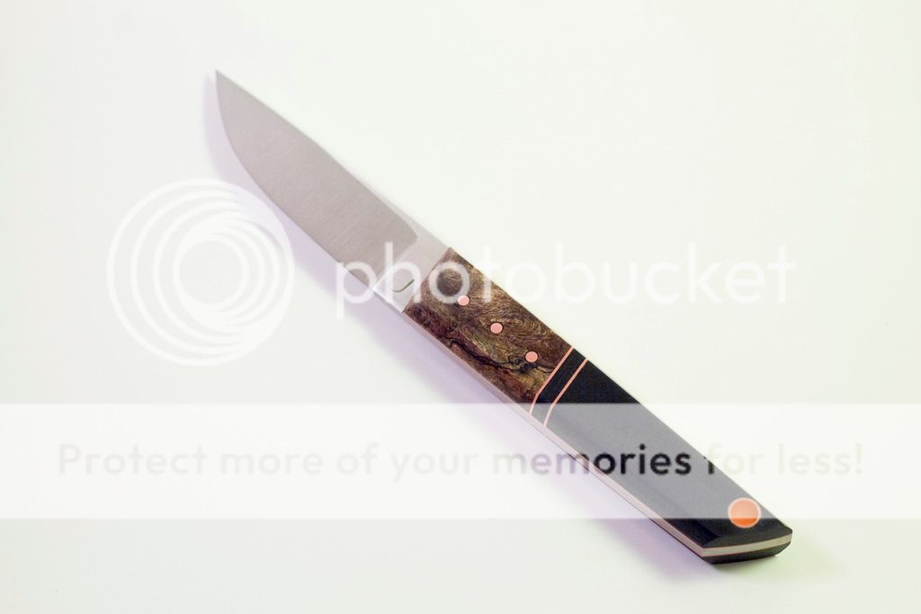 Scales are a combination of copper, Micarta, and stabilized burl