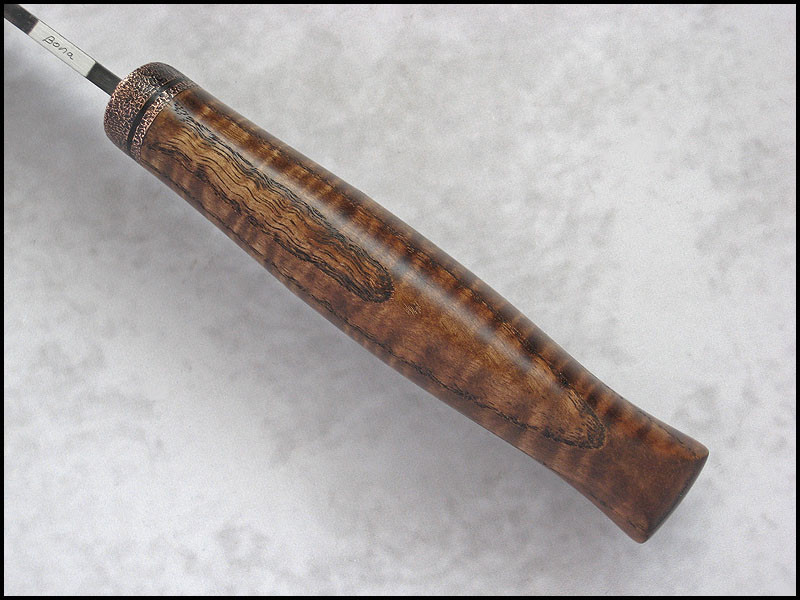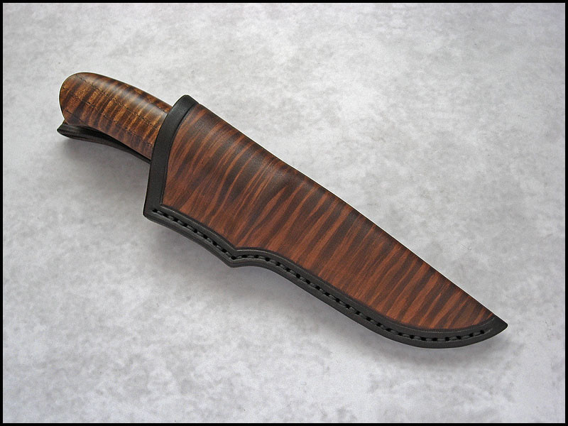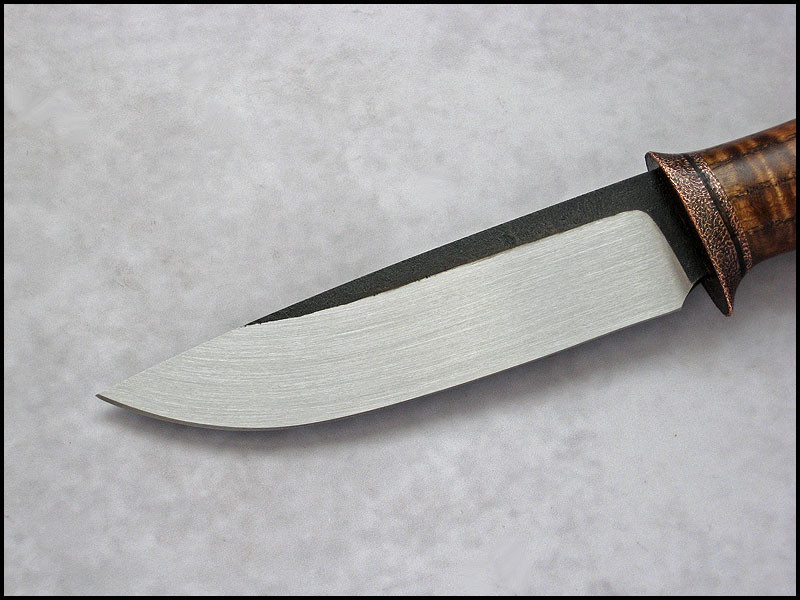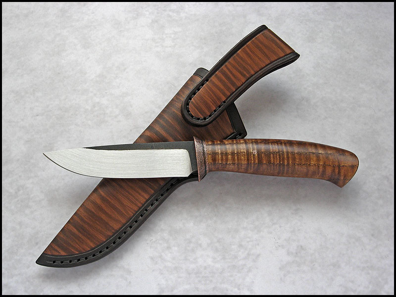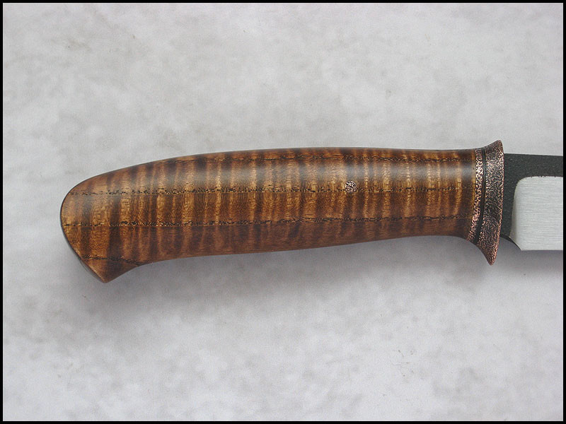 New CopperField for sale. steel high carbon NC6 / 3.7 mm [0.146"] length 241 mm [9.488"] blade 116 mm [4.567"] handle dyed curly Ash, copper sheath leather Price - 200 US Dollars. Price included International Priority Mail SOLD
