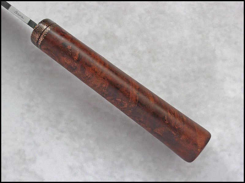 Bona The Art of Harmony Feedback: +31 / =0 / -0 Joined Apr 27, 2006 Messages 1,158 Sep 11, 2015 #1 Next one. steel high carbon NC6 / 3.7 mm [0.146"] length 242 mm [9.527"] blade 120 mm [4.724"] handle dyed Maple, copper sheath leather Price - 200 US Dollars. Price included International Priority Mail SOLD Last edited: Sep 12, 2015