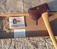 SOLD 1) Hults Bruk Tarnaby 15" Hatchet w/ 1.25lb head. Near perfect alignment and excellent handle grain/grain direction- Asking $55.00. Comes hair shaving sharp with leather sheath. (Tarnaby Hatchet is shown on left)