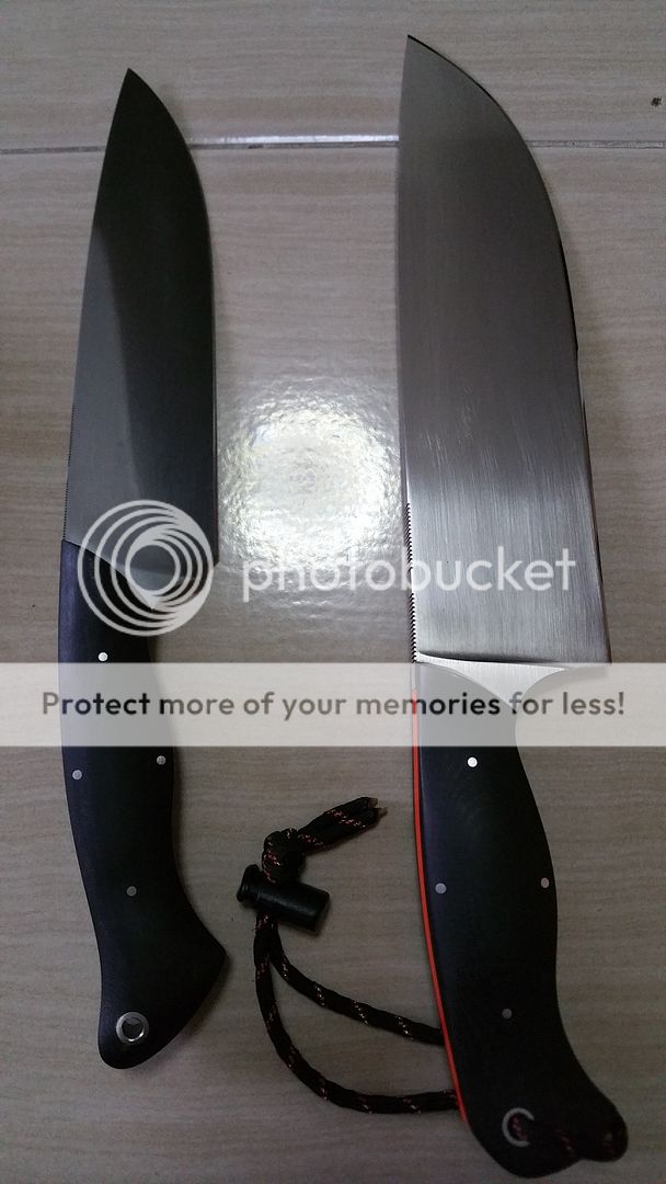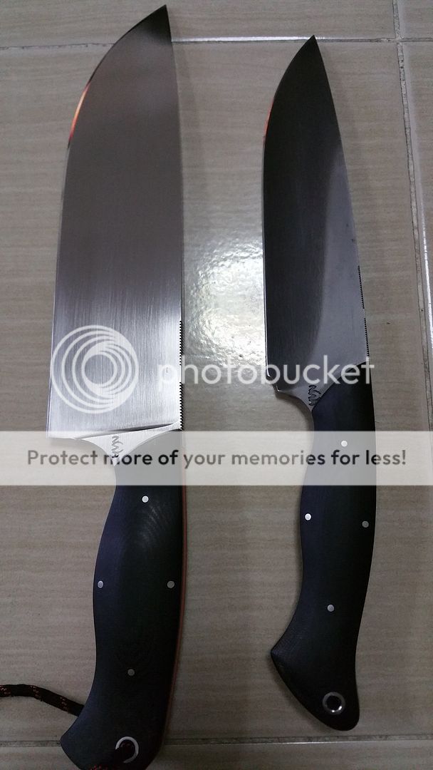 NWA(Nick Allen) Big Chopper- 8 1/2" blade, nearly 13 1/2" OAL, nearly 2 1/4" wide blade, 1/4" thick. A2 steel, hand rubbed. Hidden tang with a G10 orange spacer around it, black micarta scales. A buddy borrowed it once and used it, still shaving sharp. Couple of very light spots on blade. Comes with Nicks leather dangler sheath. $325+3.5% paypal fees