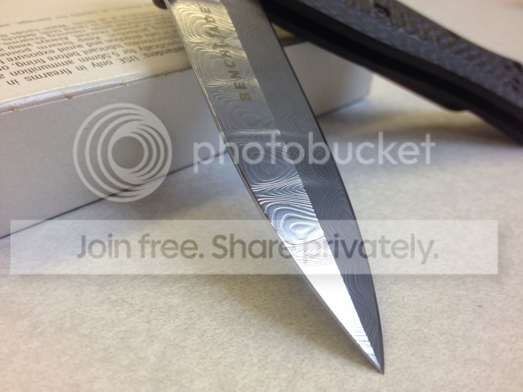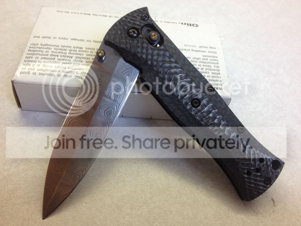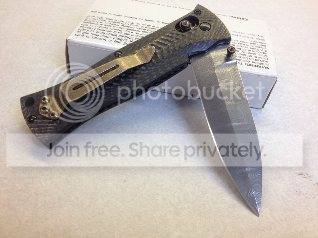 2 - Benchmade 530-111 Gold Class - $525 - #59 of 200 I bought this brand new last fall. Is still in phenomenal condition despite being carried off and on around the house. Has actually seen very little use. Scales are perfect, all the hardware looks good, no scuffing or scratches. The pocket clip is essentially brand new, I took it off the knife immediately and replaced it with a Steel Flame clip (which is not included, it has been sold seperately). The blade is in excellent condition, it hasn't been sharpened but has been stropped lightly. Fine tip of the blade is 100% intact. The only mark on the knife worth noting is a small scratch beneath the number on the right side of the blade. Shows up in the pictures. Includes all original baggy/box/info card, etc... I realize this is priced high, but I don't see these for sale very often and am only offering it if someone else really wants one